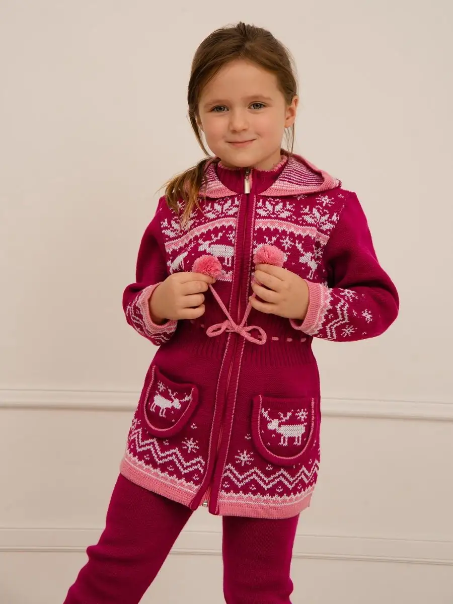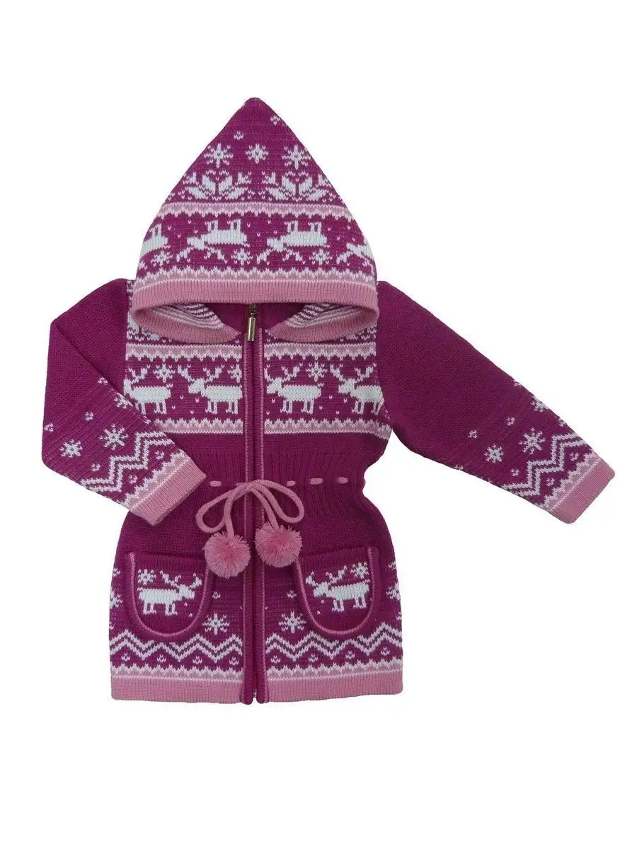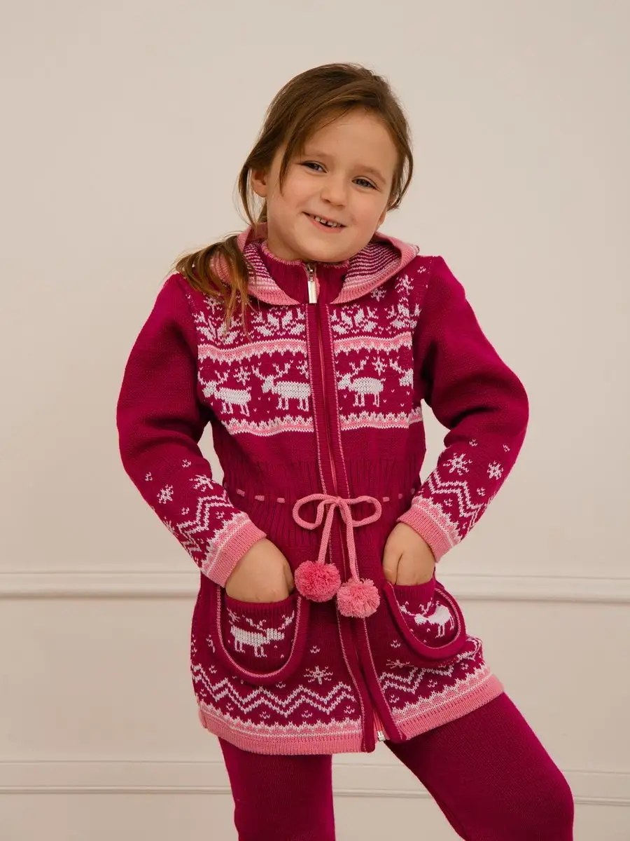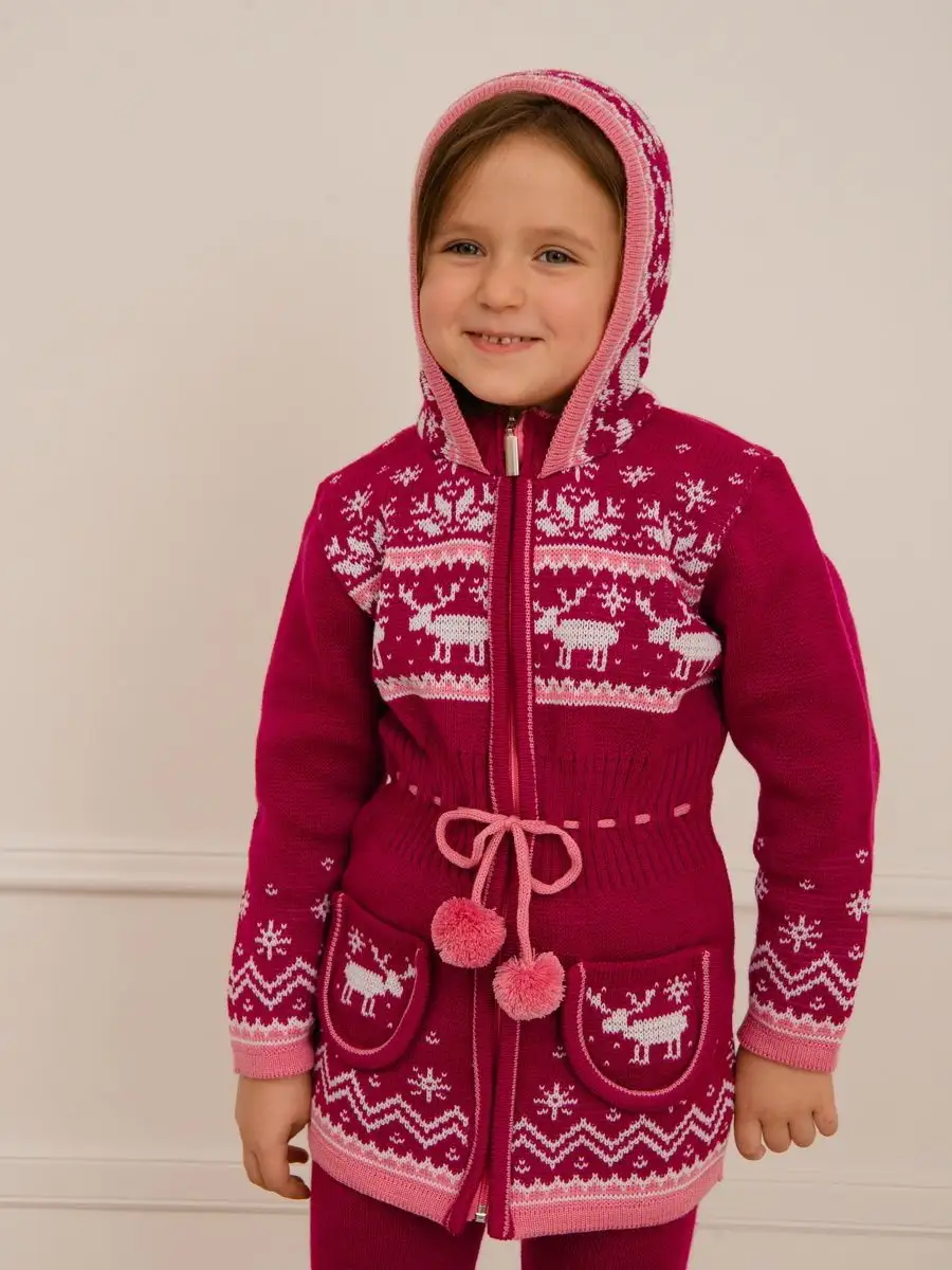 Кардиган вязаный для девочки на молнии с капюшоном и двумя карманами должен быть в повседневном гардеробе у каждой модницы. Особенностью модели является отделка по талии шнуром с помпонами, которая делает кардиган более интересным, а накладные карманы придают функциональности. Кофта для девочки украшена орнаментом в скандинавском стиле. Кардиган выполнен в технике жаккард без протяжек нити на изнаночной стороне. Вязаный кардиган комфортная и теплая вещь для носки в прохладную погоду, для праздничной фотосессии, а также станет прекрасной идеей для подарка. Кардиган выполнен из гипоаллергенной пряжи, поэтому юной моднице будет в нем комфортно, а благодаря свободному крою не стесняет движения. Высокое качество, тщательность исполнения и ручная отделка являются неоспоримыми преимуществами. При выборе размера советуем руководствоваться таблицей в карточке товара.