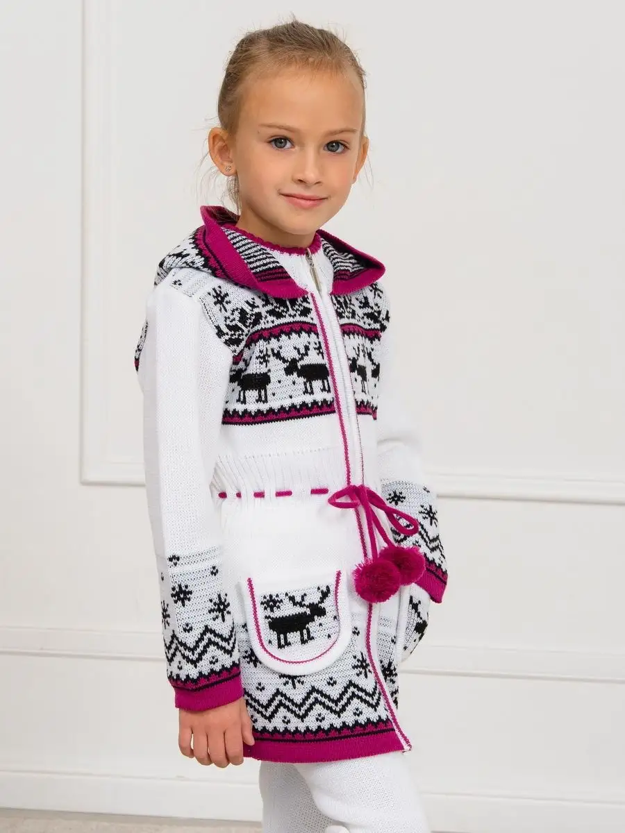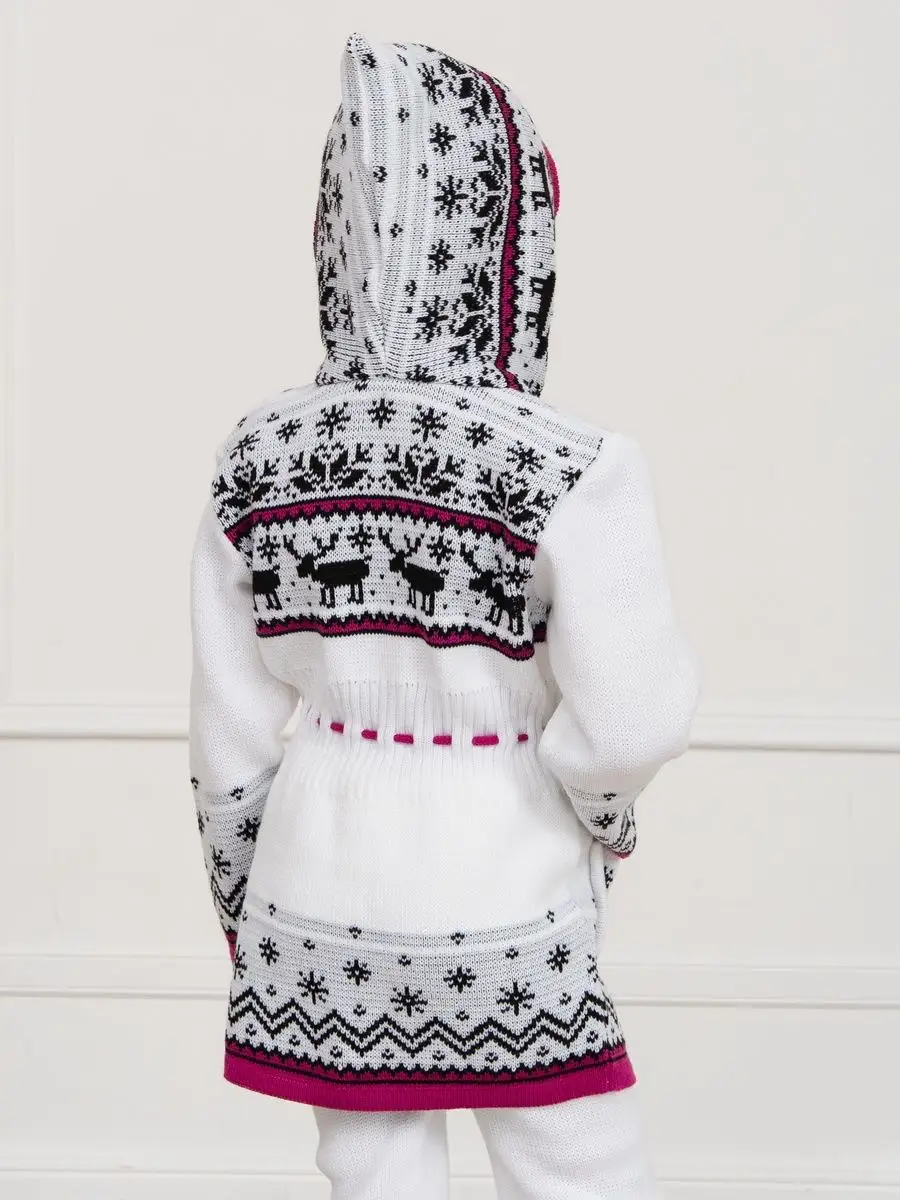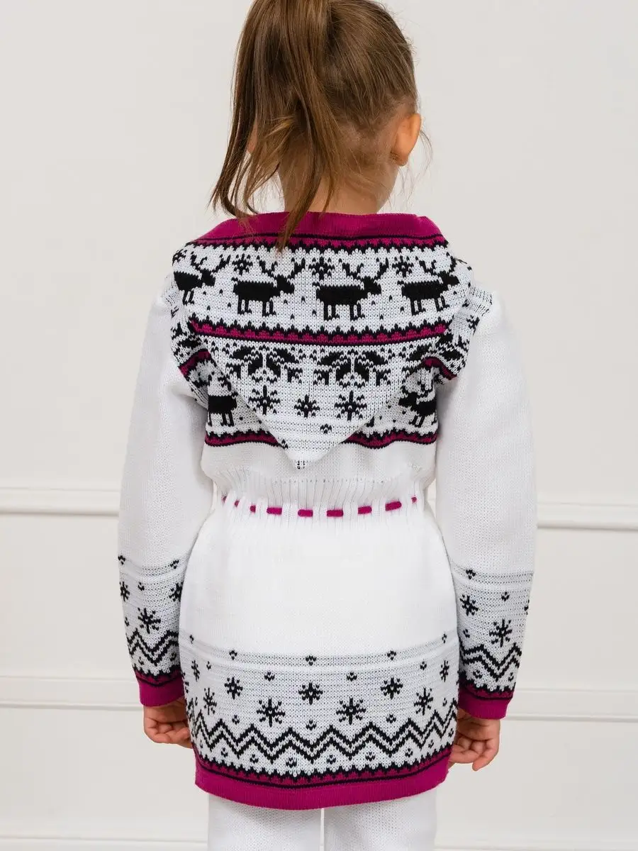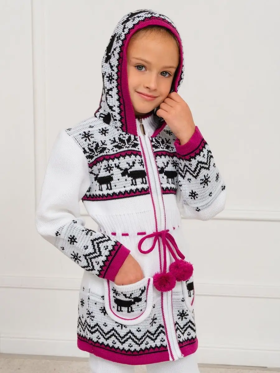 Кардиган вязаный для девочки на молнии с капюшоном и двумя карманами должен быть в повседневном гардеробе у каждой модницы. Особенностью модели является отделка по талии шнуром с помпонами, которая делает кардиган более интересным, а накладные карманы придают функциональности. Кофта для девочки украшена орнаментом в скандинавском стиле. Кардиган выполнен в технике жаккард без протяжек нити на изнаночной стороне. Вязаный кардиган комфортная и теплая вещь для носки в прохладную погоду, для праздничной фотосессии, а также станет прекрасной идеей для подарка. Кардиган выполнен из гипоаллергенной пряжи, поэтому юной моднице будет в нем комфортно, а благодаря свободному крою не стесняет движения. Высокое качество, тщательность исполнения и ручная отделка являются неоспоримыми преимуществами. При выборе размера советуем руководствоваться таблицей в карточке товара.