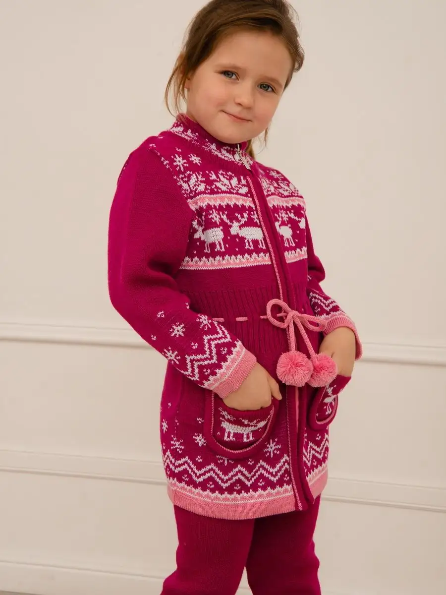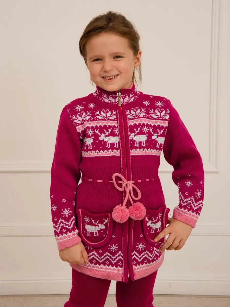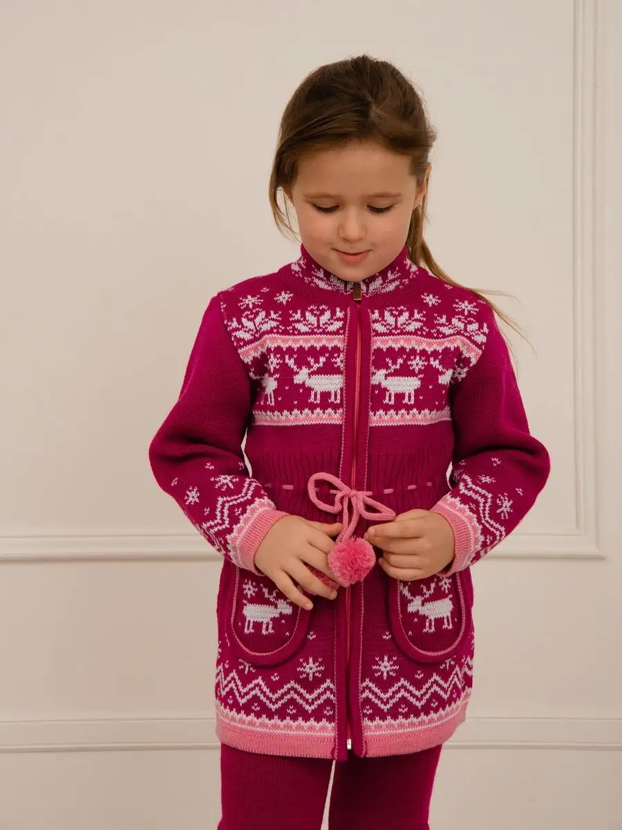 Кардиган вязаный для девочки на молнии с двумя карманами должен быть в повседневном гардеробе у каждой модницы. Особенностью модели является отделка по талии шнуром с помпонами, которая делает кардиган более интересным, а накладные карманы придают функциональности. Кофта для девочки украшена орнаментом в скандинавском стиле. Кардиган выполнен в технике жаккард без протяжек нити на изнаночной стороне. Вязаный кардиган комфортная и теплая вещь для носки в прохладную погоду, для праздничной фотосессии, а также станет прекрасной идеей для подарка. Кардиган выполнен из гипоаллергенной пряжи, поэтому юной моднице будет в нем комфортно, а благодаря свободному крою не стесняет движения. Высокое качество, тщательность исполнения и ручная отделка являются неоспоримыми преимуществами. При выборе размера советуем руководствоваться таблицей в карточке товара.