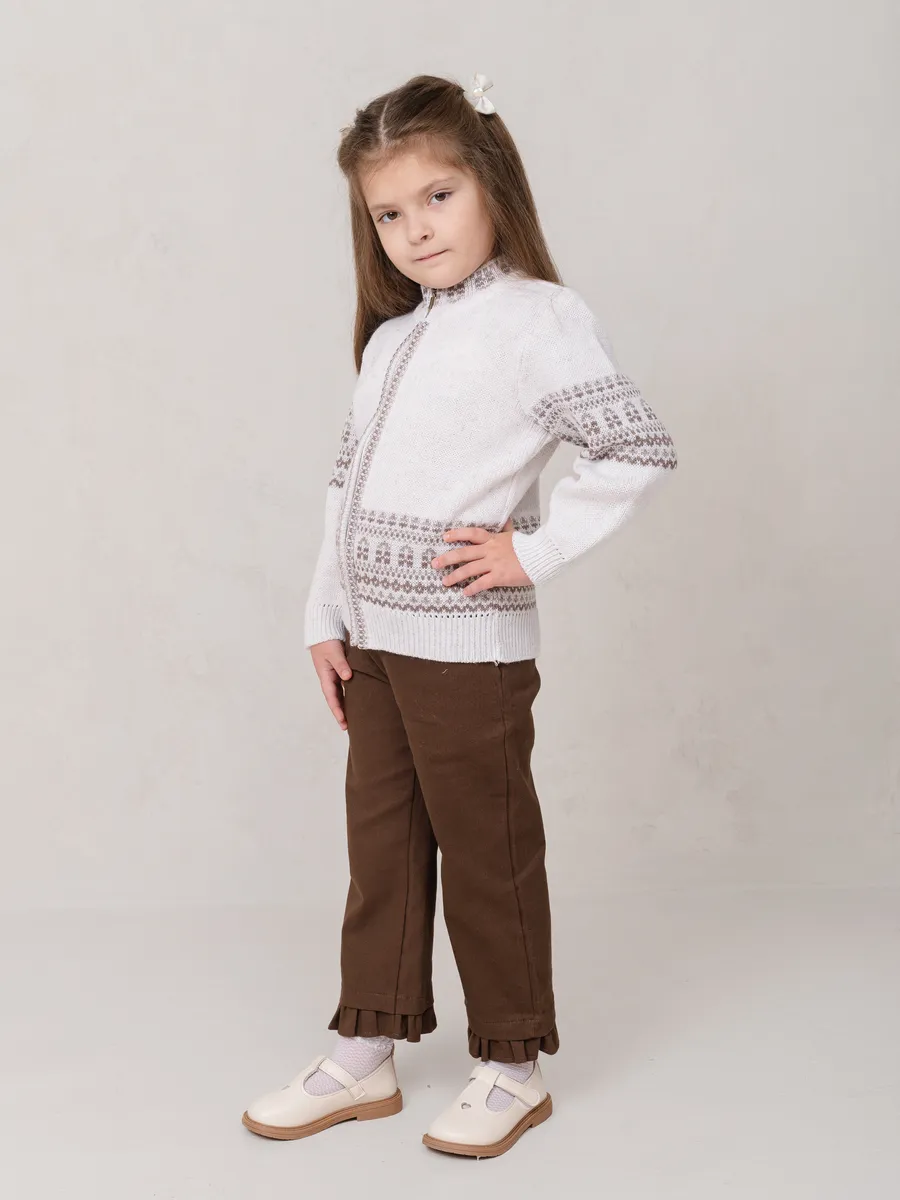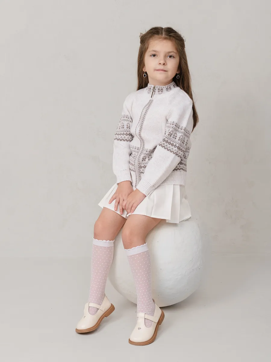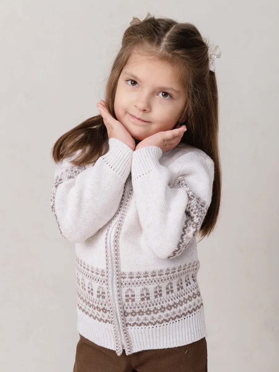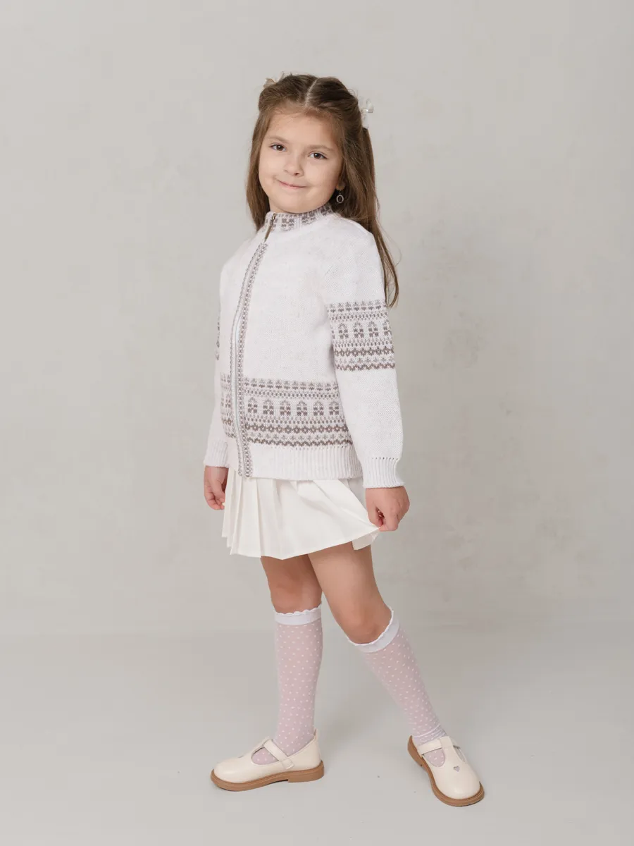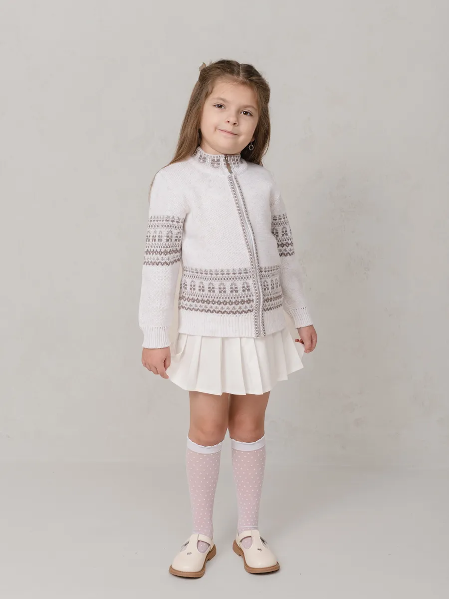 Теплый и стильный кардиган станет отличным выбором для девочки в школу или садик. Эта модель сочетает в себе комфорт и практичность, обеспечивая уют даже в прохладную погоду. Удобная застежка делает изделие функциональным и легким в использовании. Подойдет для повседневной носки, а также праздничных мероприятий благодаря аккуратному дизайну с узорами.Кардиган выполнен из мягкого материала, приятного к телу. Вязка придает вещи дополнительное тепло и оригинальный внешний вид. Идеален для школьных будней или прогулок на свежем воздухе. Благодаря универсальному фасону он подойдет как для учебы, так и для активного времяпрепровождения.Низ изделия на резинке обеспечивает комфортную посадку и удерживает тепло. Эта удлиненная модель прекрасно сочетается с юбками, брюками или платьями. Белый цвет добавляет нарядности, подчеркивая изысканность образа девочки.Практичное решение для холодного времени года – теплая вещь, которая сохранит свободу движений ребенка.
