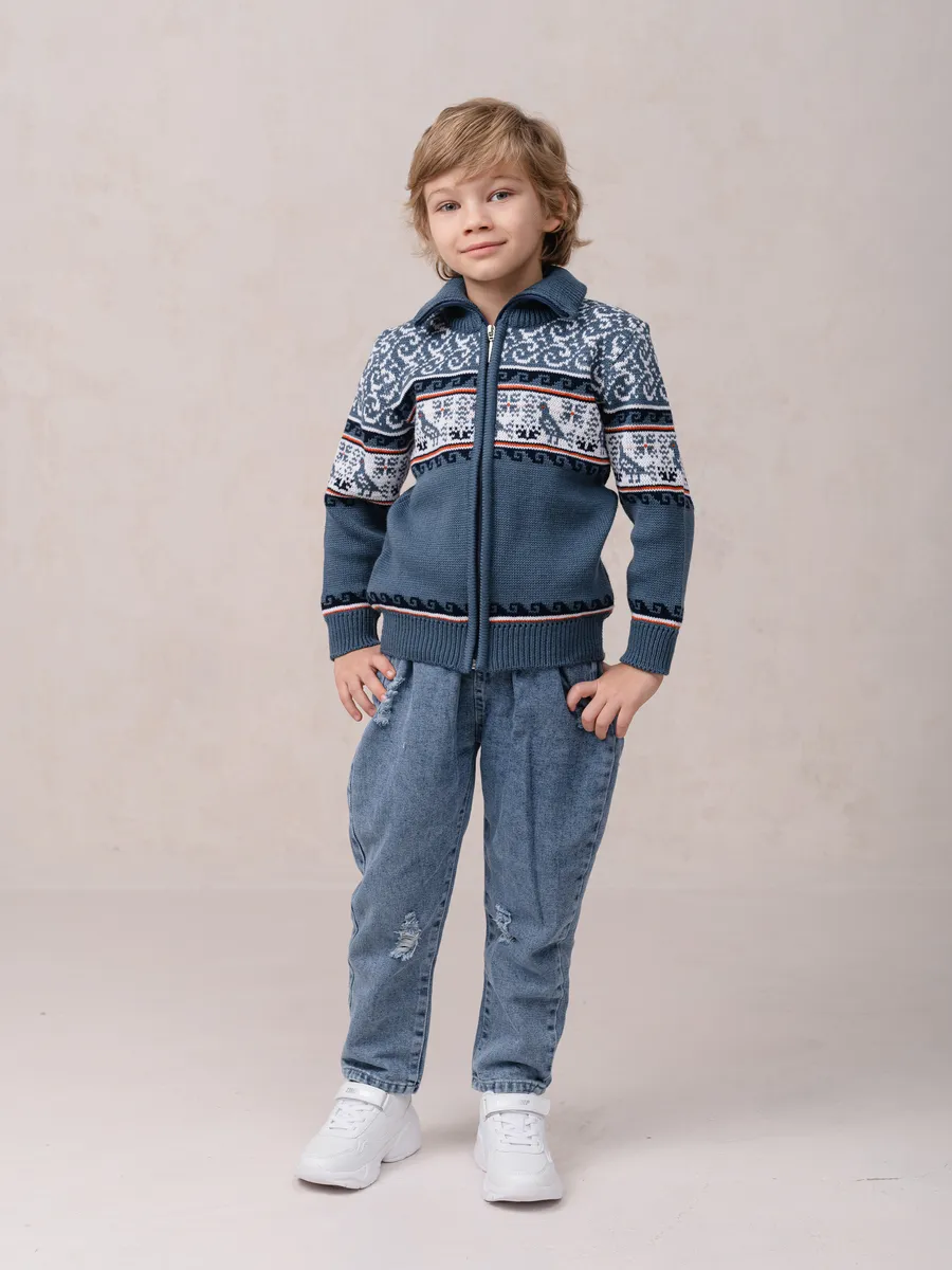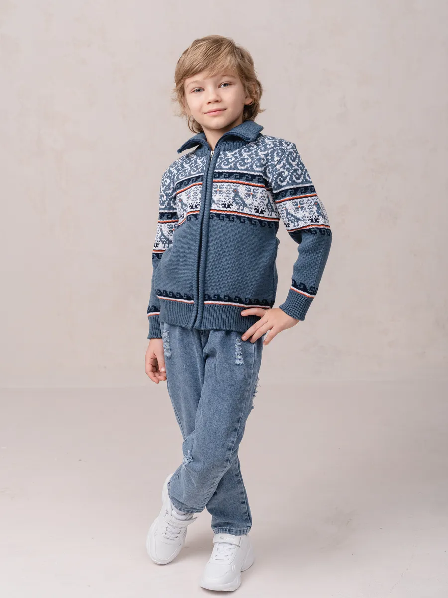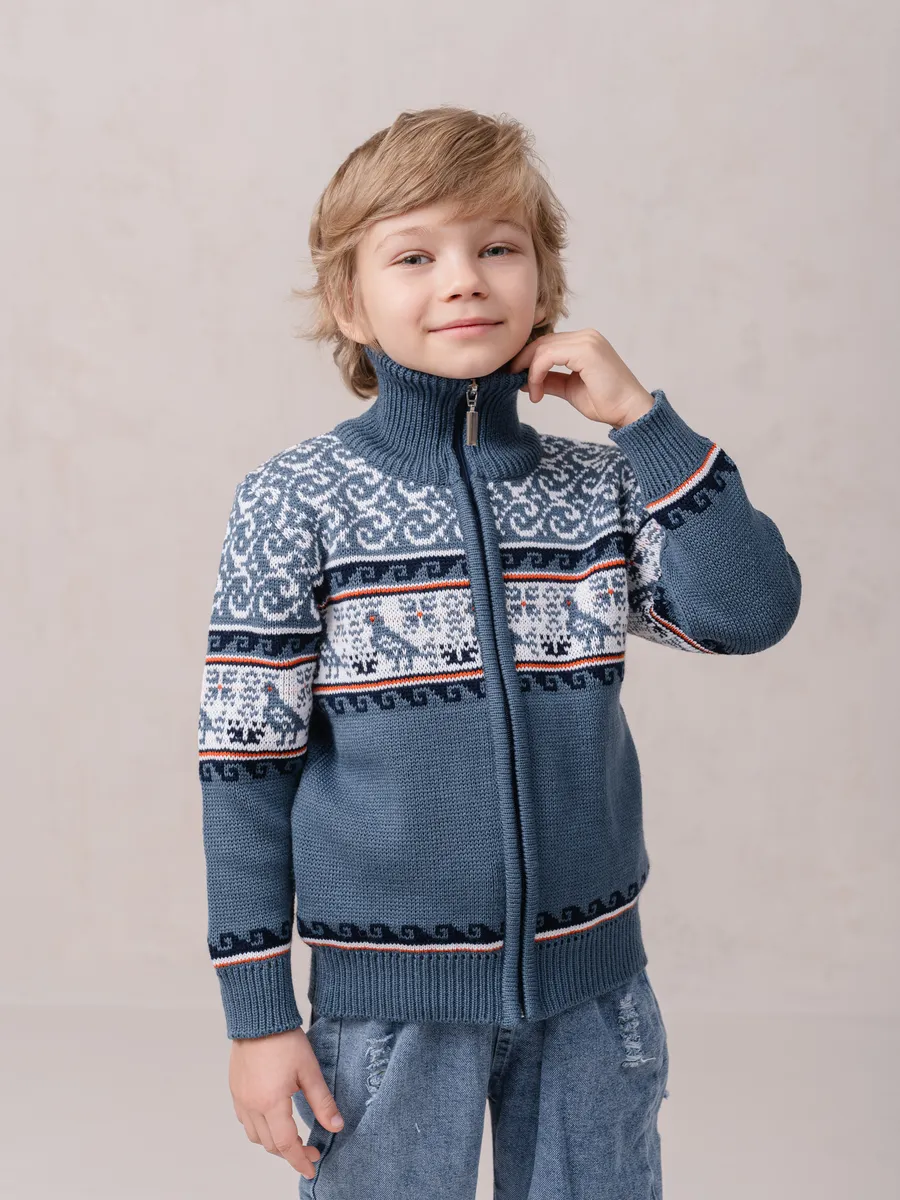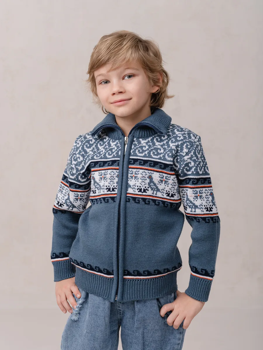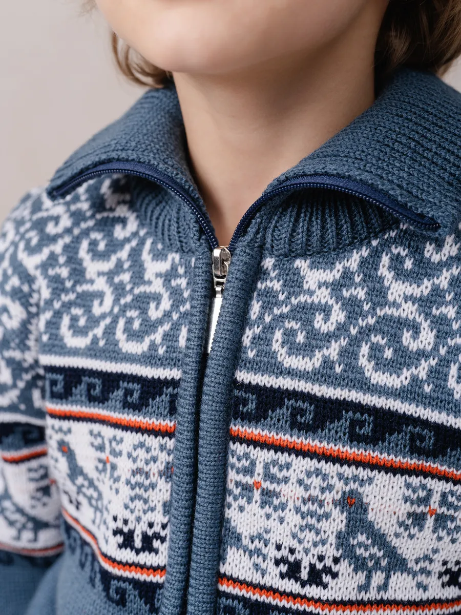 Детская вязаная кофта на молнии с воротником стойкой. Кофта выполнена в технике жаккард без протяжек нити на изнаночной стороне. Модель бомбера для малыша универсальна и подойдет как для девочки так и для мальчика. Кофта для малышей подойдет зимой как поддева, а весной, осенью и прохладным летом как верхняя одежда.