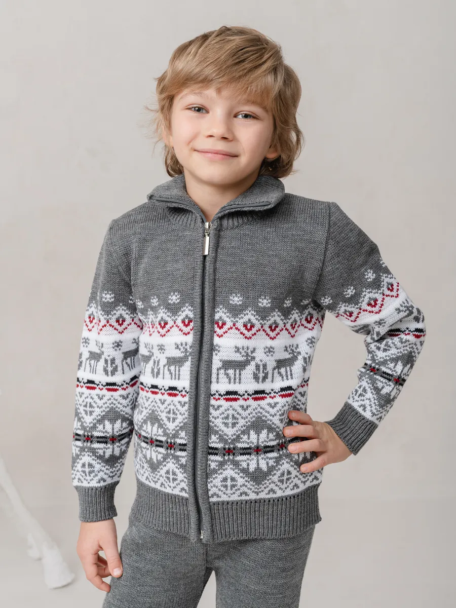 Детская вязаная кофта на молнии с воротником стойкой. Кофта выполнена в технике жаккард без протяжек нити на изнаночной стороне. Модель бомбера для малыша универсальна и подойдет как для девочки так и для мальчика. Кофта для малышей подойдет зимой как поддева, а весной, осенью и прохладным летом как верхняя одежда.