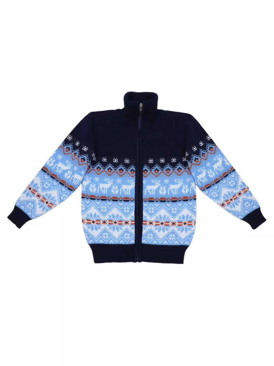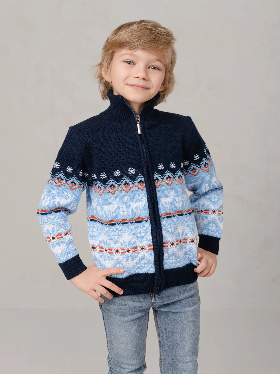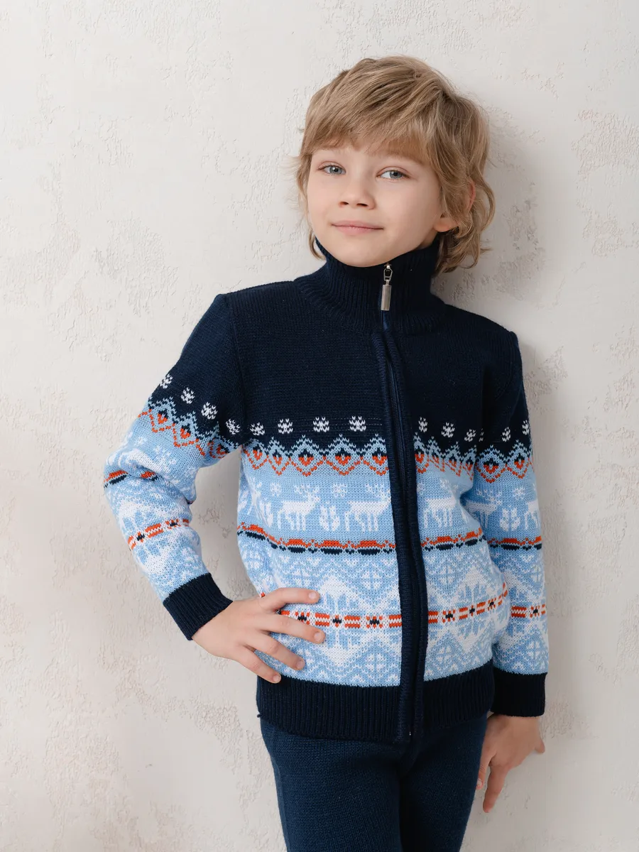 Детская вязаная кофта на молнии с воротником стойкой. Кофта выполнена в технике жаккард без протяжек нити на изнаночной стороне. Модель бомбера для малыша универсальна и подойдет как для девочки так и для мальчика. Кофта для малышей подойдет зимой как поддева, а весной, осенью и прохладным летом как верхняя одежда. Теплая детская кофта выполнена из гипоаллергенной пряжи, поэтому ребенку будет в ней комфортно, а благодаря свободному крою не стесняет движения. Вязаная кофта подойдет для повседневной носки в школу и детский сад, для дома и для прогулок в любое время года. Высокое качество, тщательность исполнения и ручная отделка являются неоспоримыми преимуществами. При выборе размера советуем руководствоваться таблицей в карточке товара.
