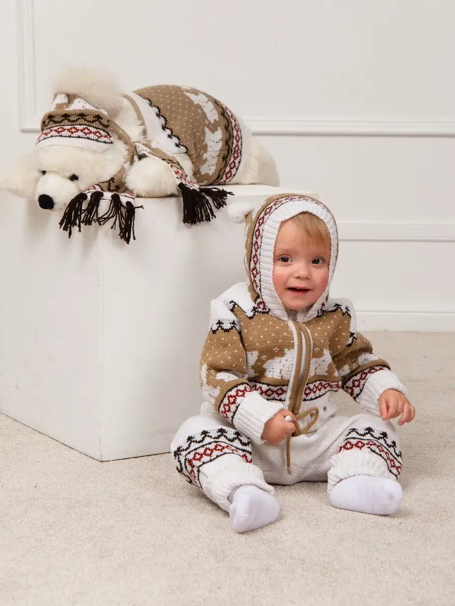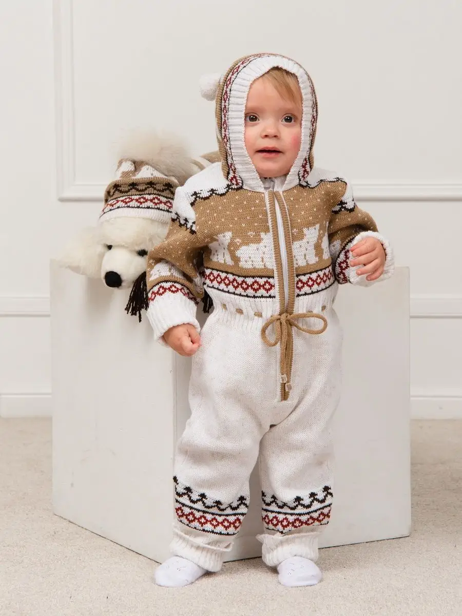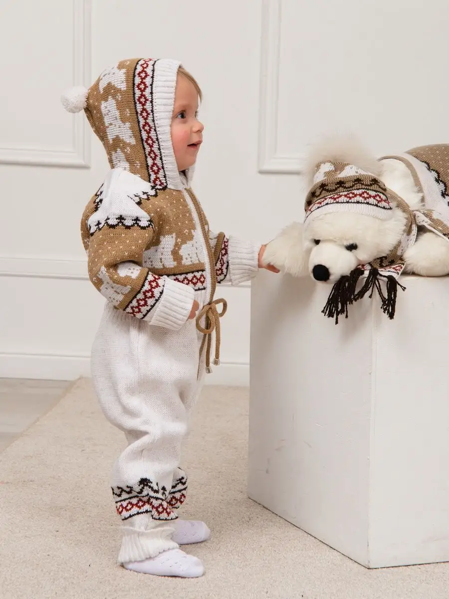 Красивый комбинезон с мишками для стильных малышей и родителей, которые ценят натуральные материалы. Данная модель -отличный вариант для ежедневных прогулок. Комбинезон имеет отгибающиеся манжеты на рукавах и штанишках, а также место для подгузника. Комбинезон изготовлен из гиппоалегргенных материалов, поэтому малышу будет очень комфортно, уютно и безопасно. Уникальный способ вязки обеспечивает необходимую терморегуляцию.