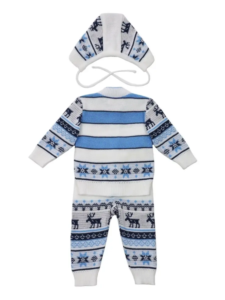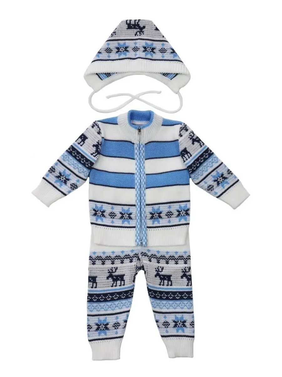 Костюмчик для самых маленьких из трех предметов: жакет на молнии, рейтузы и шапочка.