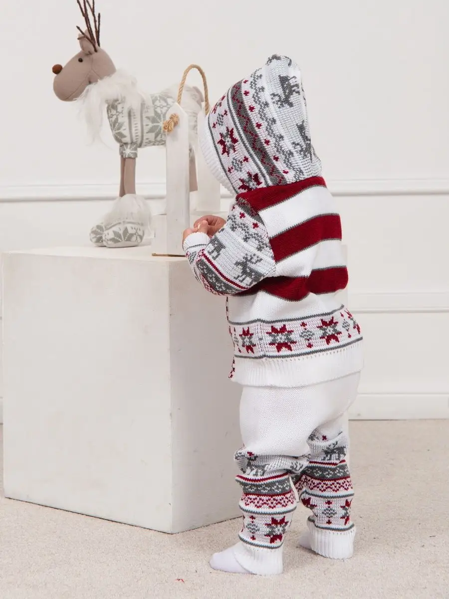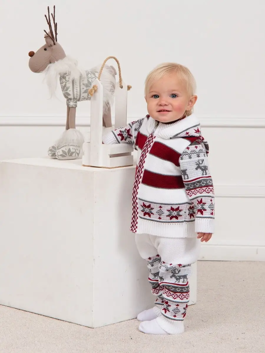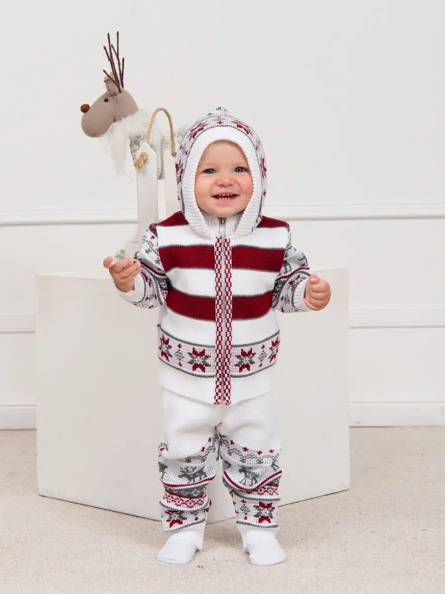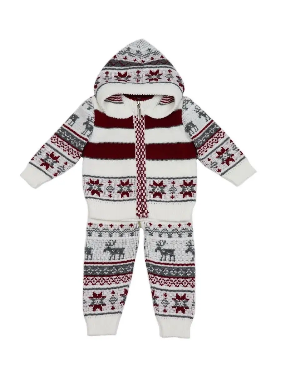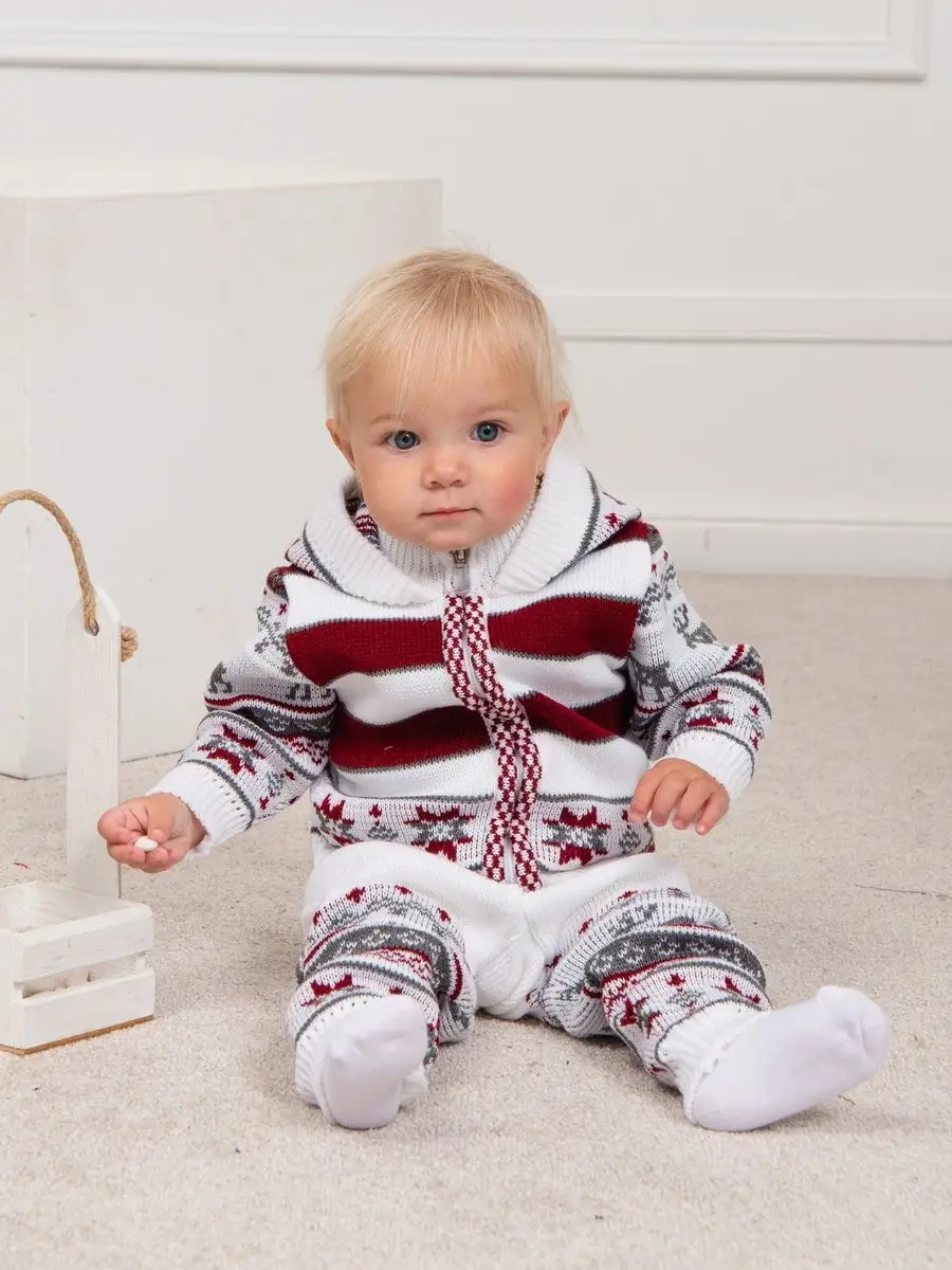 Костюм для малыша с орнаментом из двух предметов: кофта на молнии с капюшоном и рейтузы. Модель костюма универсальная и подойдет как для девочки так и для мальчика. Детский костюм идеальный вариант как для повседневной одежды второго слоя в холодное время года, так и верхней одежды в межсезонье. Теплый детский костюм выполнен из гипоаллергенной пряжи, поэтому малышу будет в нем комфортно, а благодаря свободному крою и ластовице в штанишках не стесняет движения. Вязаный комплект выполнен в технике жаккард без протяжек нити на изнаночной стороне. Высокое качество, тщательность исполнения и ручная отделка являются неоспоримыми преимуществами. При выборе размера советуем руководствоваться таблицей в карточке товара.