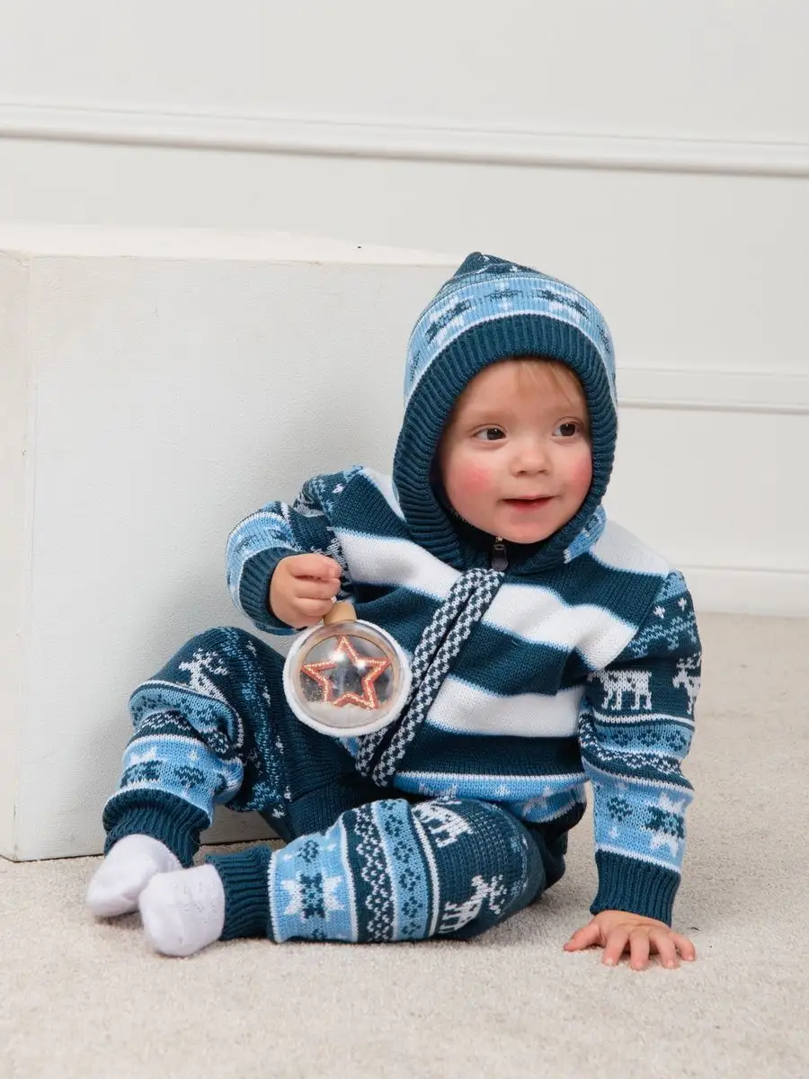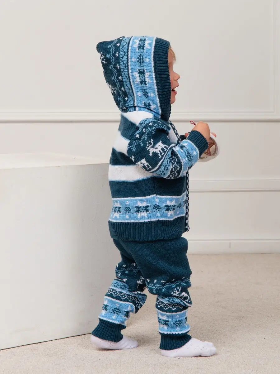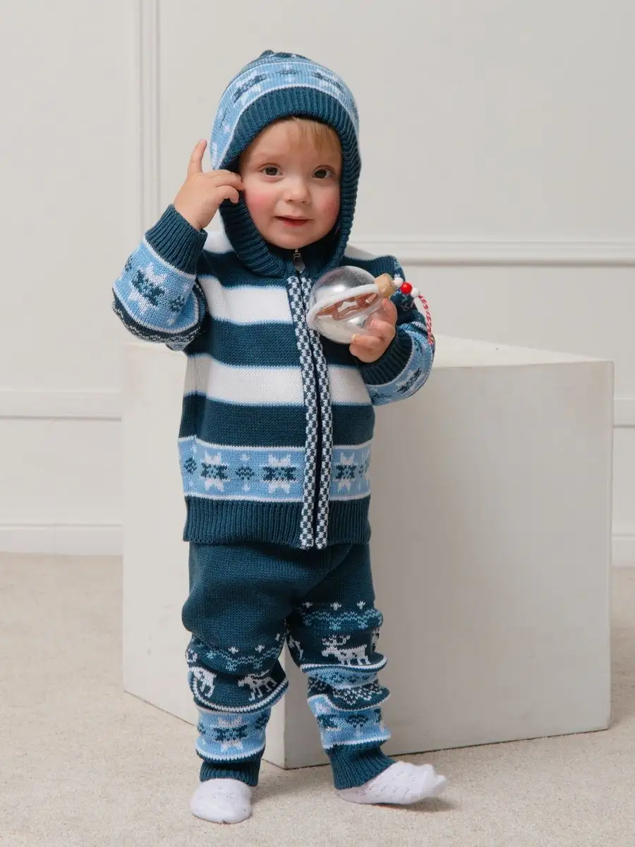 Костюм для малыша с орнаментом из двух предметов: кофта на молнии с капюшоном и рейтузы. Модель костюма универсальная и подойдет как для девочки так и для мальчика. Детский костюм идеальный вариант как для повседневной одежды второго слоя в холодное время года, так и верхней одежды в межсезонье. Теплый детский костюм выполнен из гипоаллергенной пряжи, поэтому малышу будет в нем комфортно, а благодаря свободному крою и ластовице в штанишках не стесняет движения. Вязаный комплект выполнен в технике жаккард без протяжек нити на изнаночной стороне. Высокое качество, тщательность исполнения и ручная отделка являются неоспоримыми преимуществами. При выборе размера советуем руководствоваться таблицей в карточке товара.