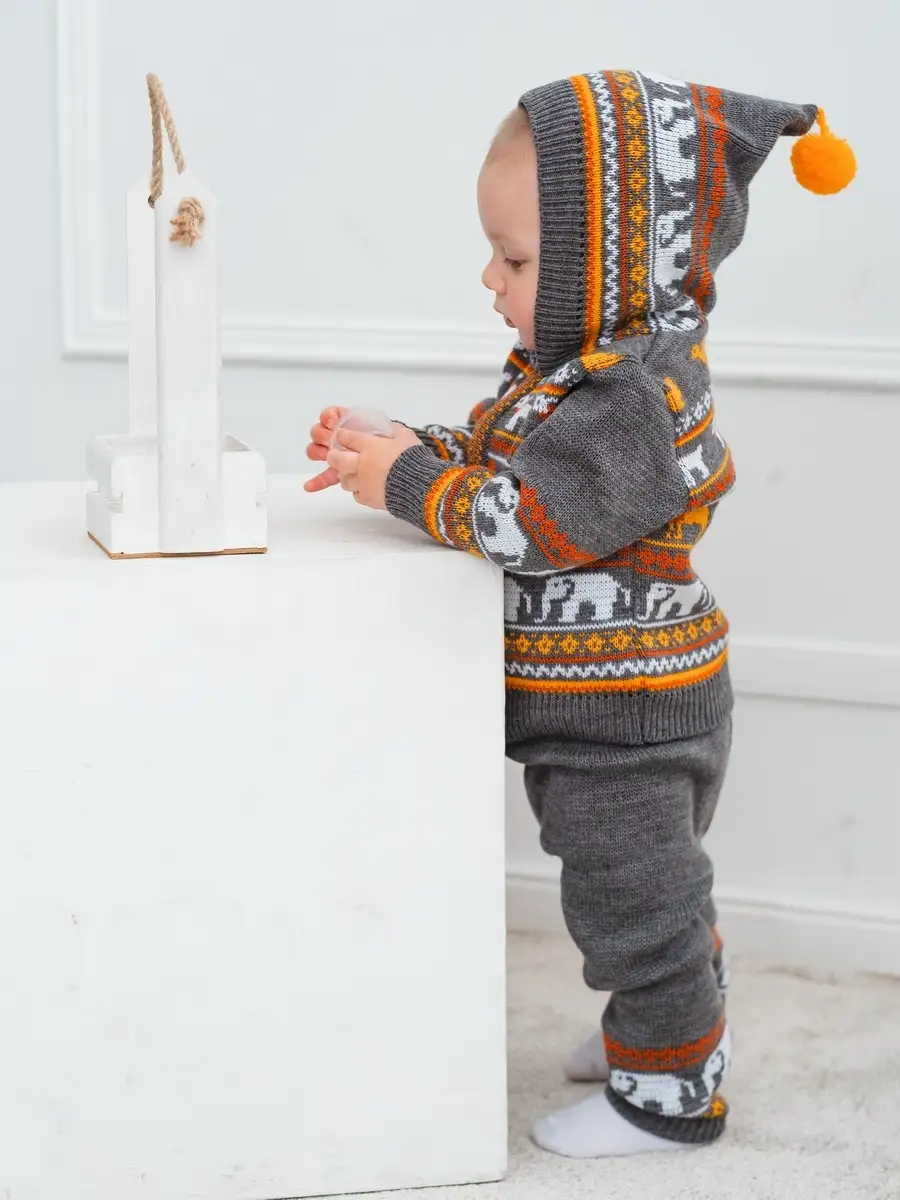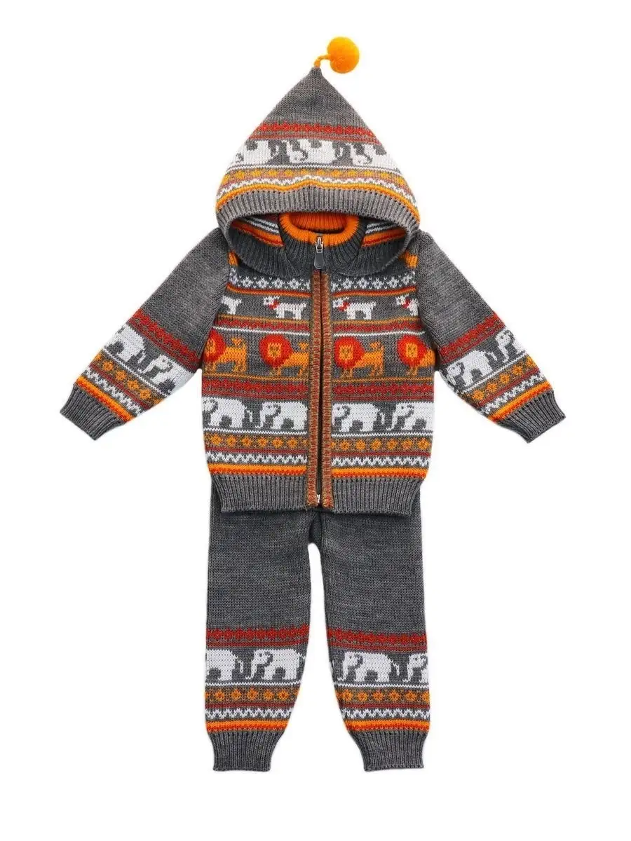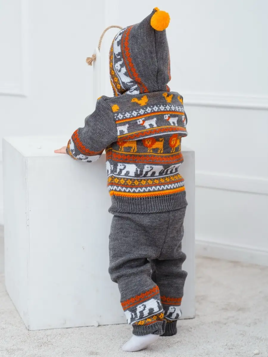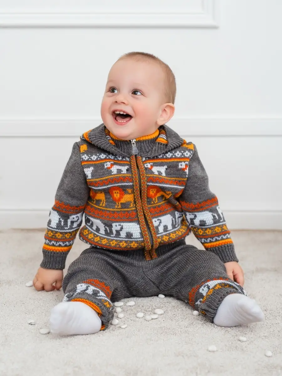 Костюм для малыша с забавным орнаментом из двух предметов: кофта на молнии с капюшоном и рейтузы. Модель костюма универсальная и подойдет как для девочки так и для мальчика. Детский костюм идеальный вариант как для повседневной одежды второго слоя в холодное время года, так и верхней одежды в межсезонье. Теплый детский костюм выполнен из гипоаллергенной пряжи, поэтому малышу будет в нем комфортно, а благодаря свободному крою и ластовице в штанишках не стесняет движения. Вязаный комплект выполнен в технике жаккард без протяжек нити на изнаночной стороне. Высокое качество, тщательность исполнения и ручная отделка являются неоспоримыми преимуществами. При выборе размера советуем руководствоваться таблицей в карточке товара.