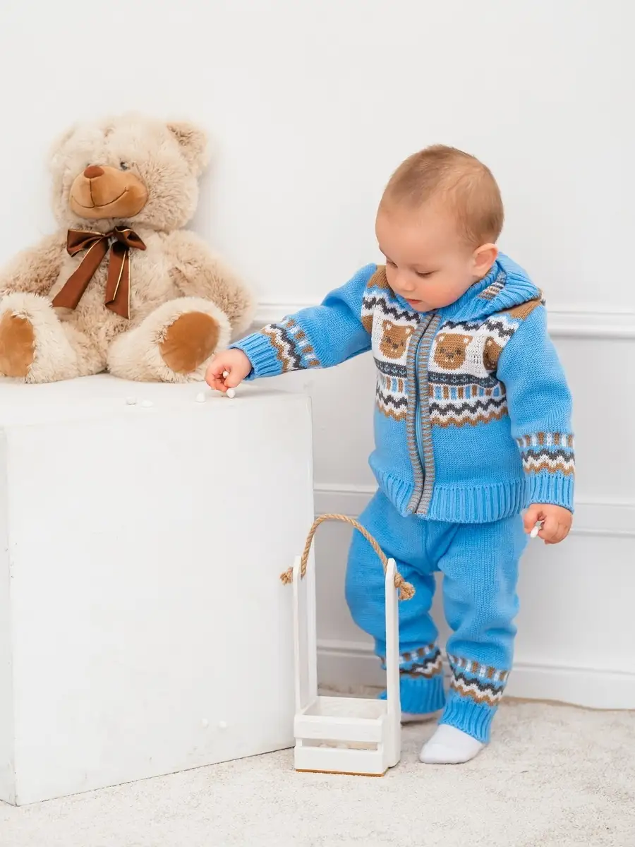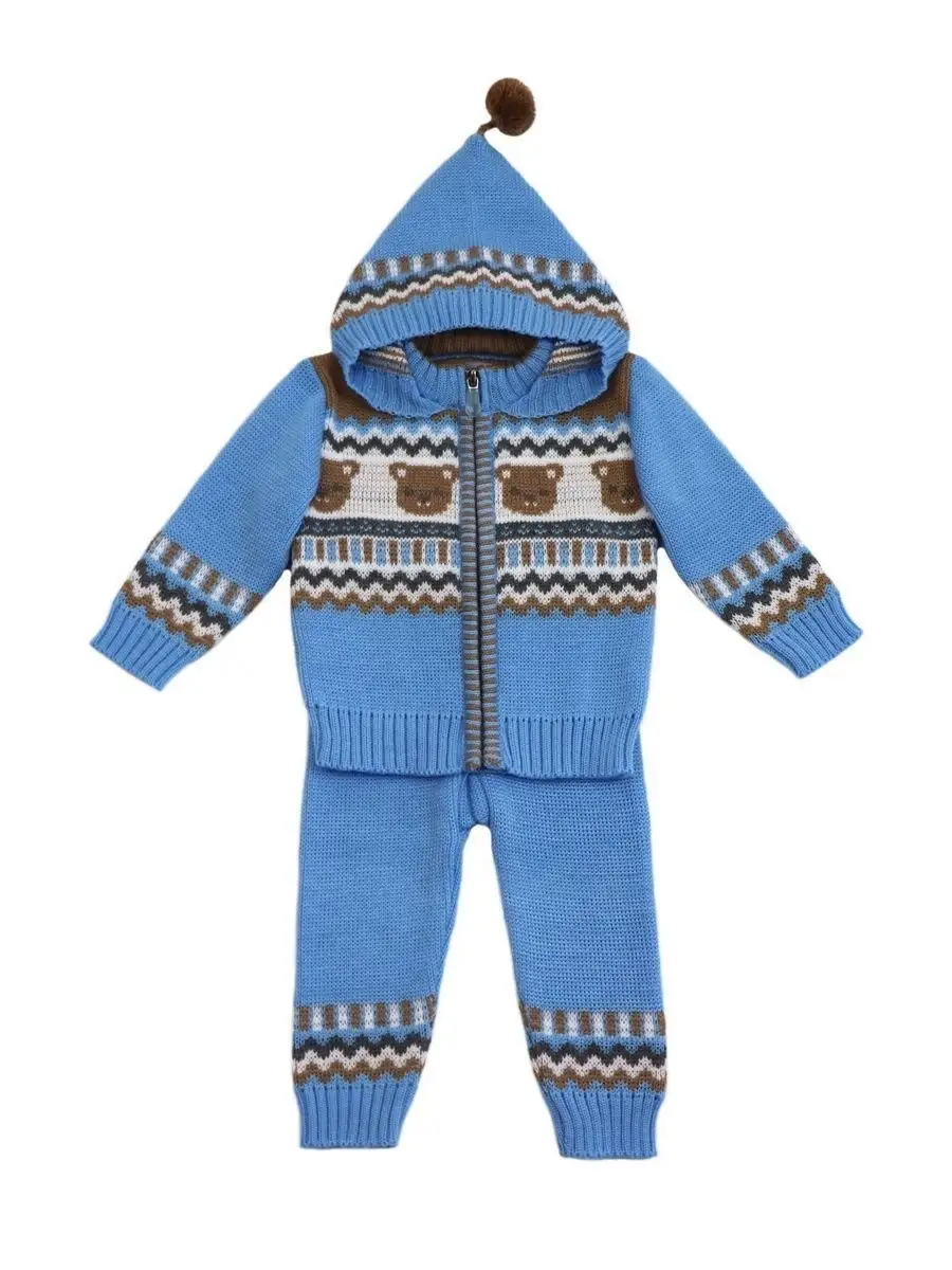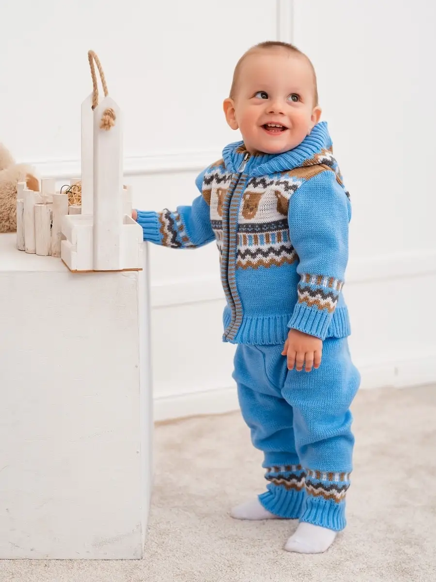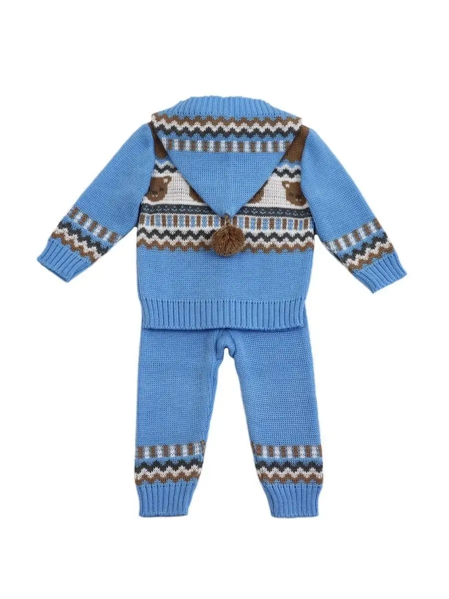 Костюм для малыша с забавным орнаментом из двух предметов: кофта на молнии с капюшоном и рейтузы. Модель костюма универсальная и подойдет как для девочки так и для мальчика. Детский костюм идеальный вариант как для повседневной одежды второго слоя в холодное время года, так и верхней одежды в межсезонье. Теплый детский костюм выполнен из гипоаллергенной пряжи, поэтому малышу будет в нем комфортно, а благодаря свободному крою и ластовице в штанишках не стесняет движения. Вязаный комплект выполнен в технике жаккард без протяжек нити на изнаночной стороне. Высокое качество, тщательность исполнения и ручная отделка являются неоспоримыми преимуществами. При выборе размера советуем руководствоваться таблицей в карточке товара.