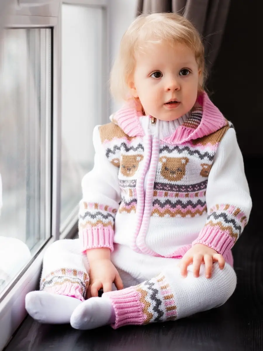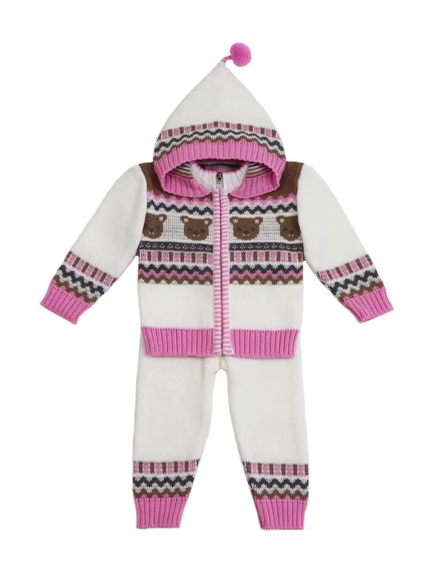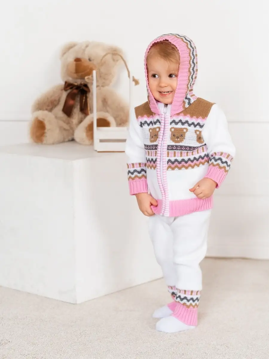 Костюм для малыша с забавным орнаментом из двух предметов: кофта на молнии с капюшоном и рейтузы. Модель костюма универсальная и подойдет как для девочки так и для мальчика. Детский костюм идеальный вариант как для повседневной одежды второго слоя в холодное время года, так и верхней одежды в межсезонье. Теплый детский костюм выполнен из гипоаллергенной пряжи, поэтому малышу будет в нем комфортно, а благодаря свободному крою и ластовице в штанишках не стесняет движения. Вязаный комплект выполнен в технике жаккард без протяжек нити на изнаночной стороне. Высокое качество, тщательность исполнения и ручная отделка являются неоспоримыми преимуществами. При выборе размера советуем руководствоваться таблицей в карточке товара.