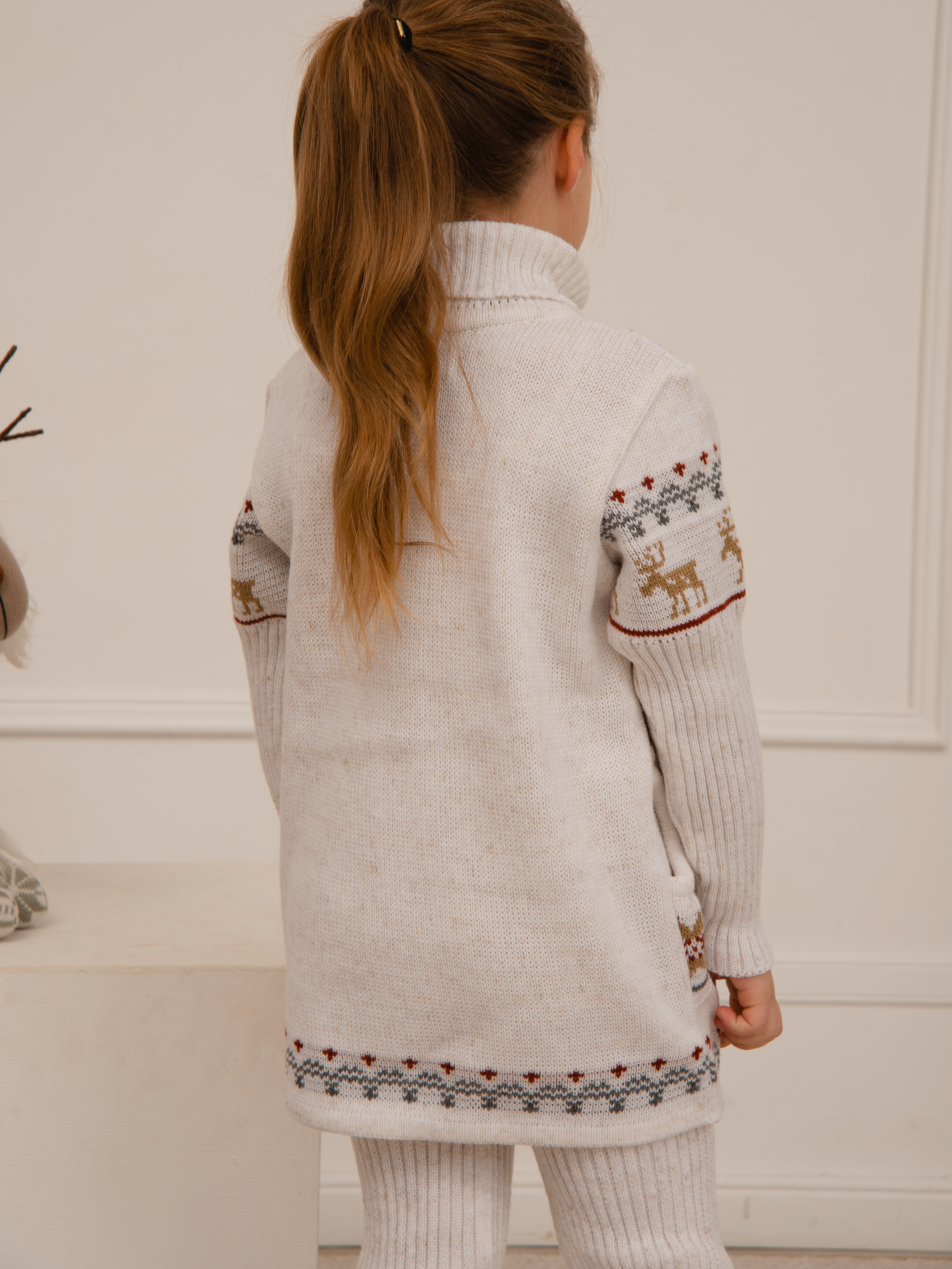 Платье вязаное для девочки со свитерным воротником, с длинными рукавами и круглыми боковыми карманами. Особенностью модели является кокетка, которая делает платье более интересным, а боковые круглые карманы придают функциональности. Платье туника вязаное имеет длину мини и может сочетаться как с леггинсами, так и с колготками. Туника для девочки украшена орнаментом в скандинавском стиле. Платье свитер комфортная и теплая вещь для носки в прохладную погоду, в новогодние дни, для праздничной фотосессии, а также станет прекрасной идеей для подарка. Платье туника для девочки выполнено из гипоаллергенной пряжи, поэтому юной моднице будет в нем комфортно, а благодаря свободному крою не стесняет движения. При выборе размера советуем руководствоваться таблицей в карточке товара.