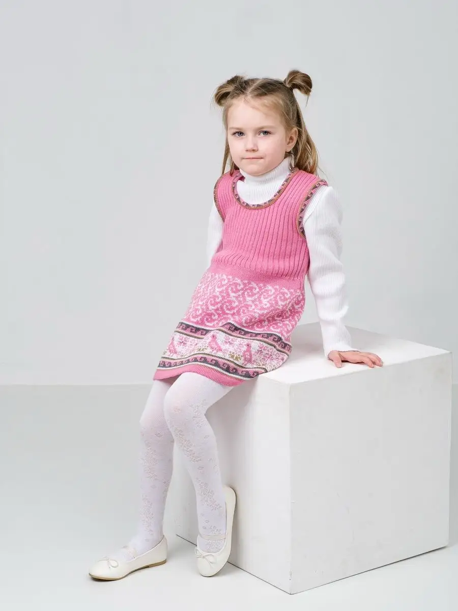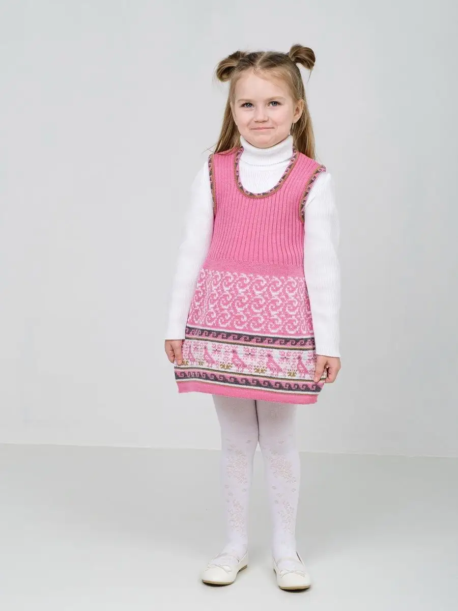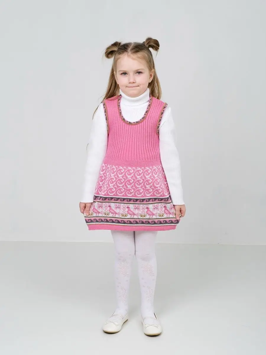 Сарафан для девочки вязаный с орнаментом. Сарафан платье выполнен из гипоаллергенной пряжи, поэтому юной моднице будет в нем комфортно, а благодаря полуприлегающему крою и вязке "резинкой" не стесняет движения. Сарафан для девочки в садик выполнен в технике жаккард, что делает модель нарядной и оригинальной. Сарафан подойдёт как для повседневной носки, так и на праздничный выход на утренник, день рождения, в цирк или в театр. При выборе размера советуем руководствоваться таблицей в карточке товара.