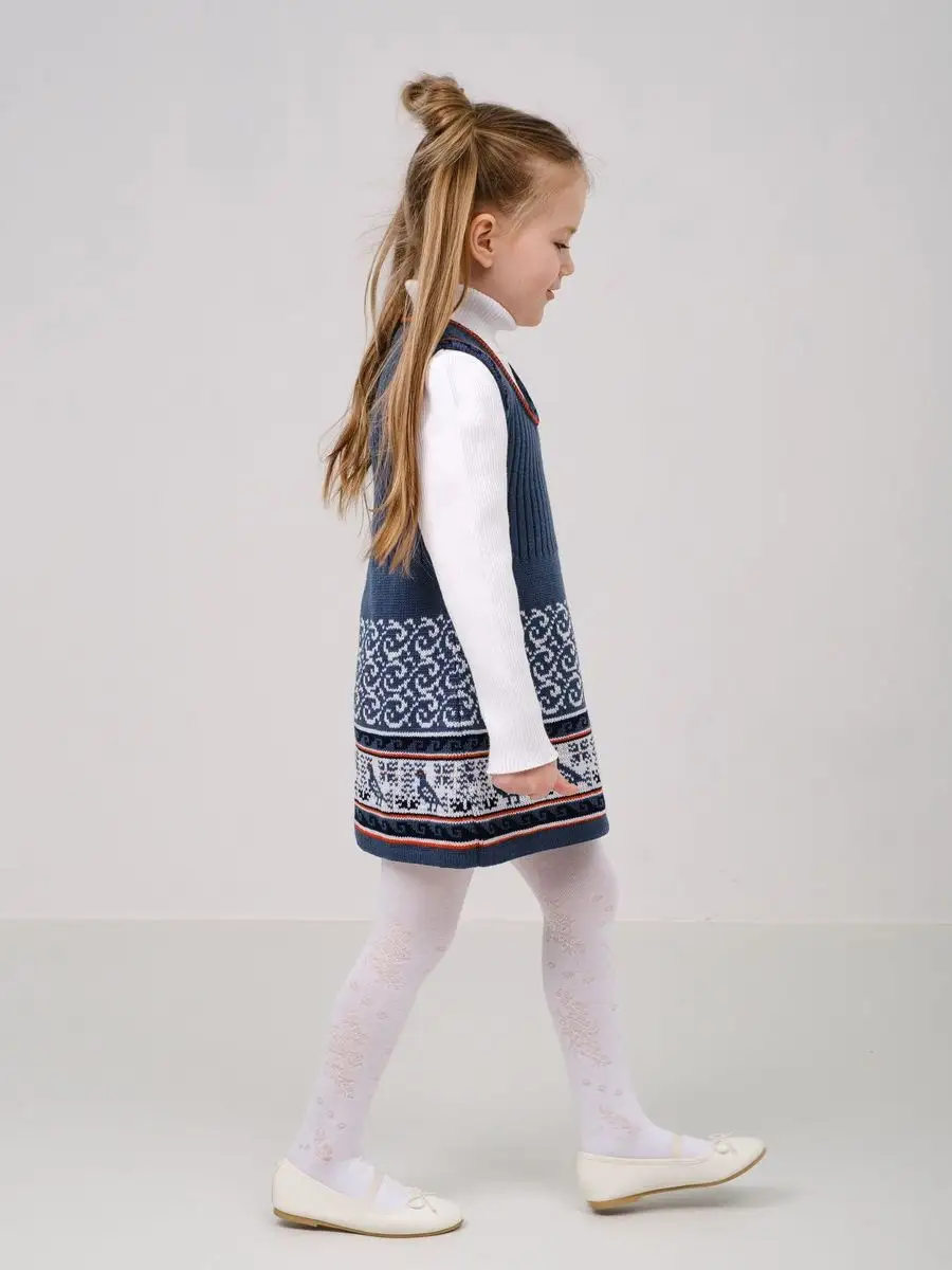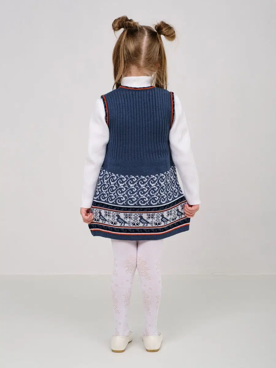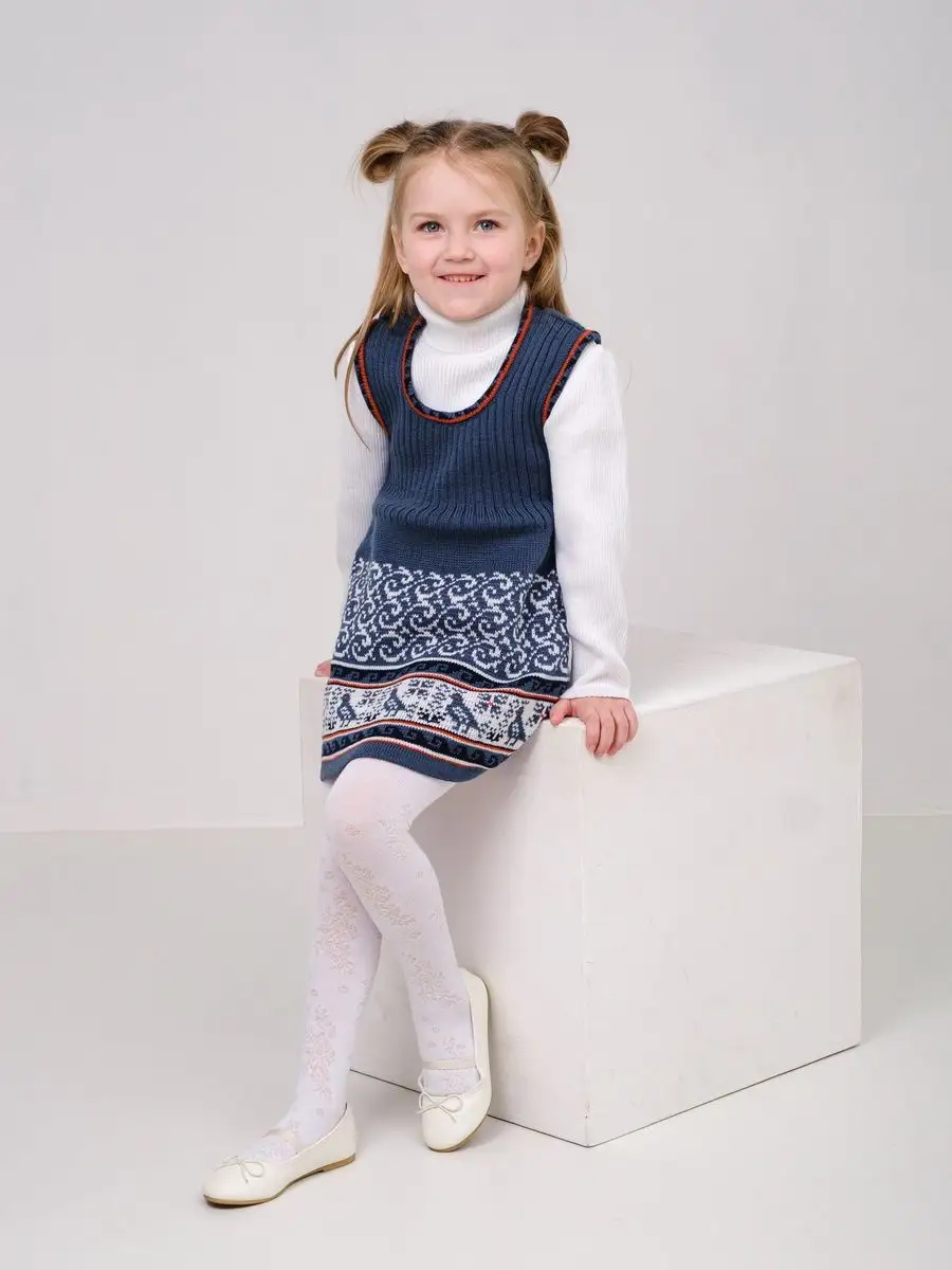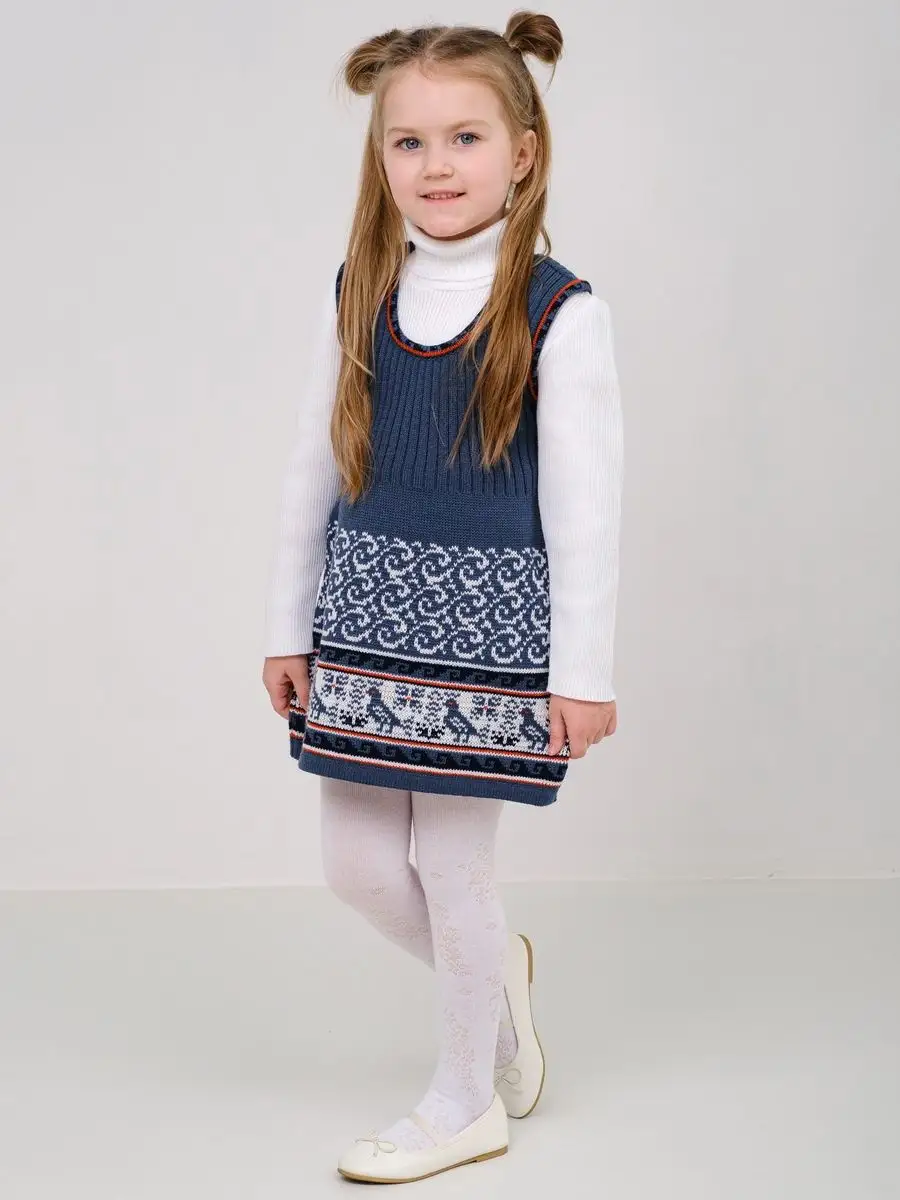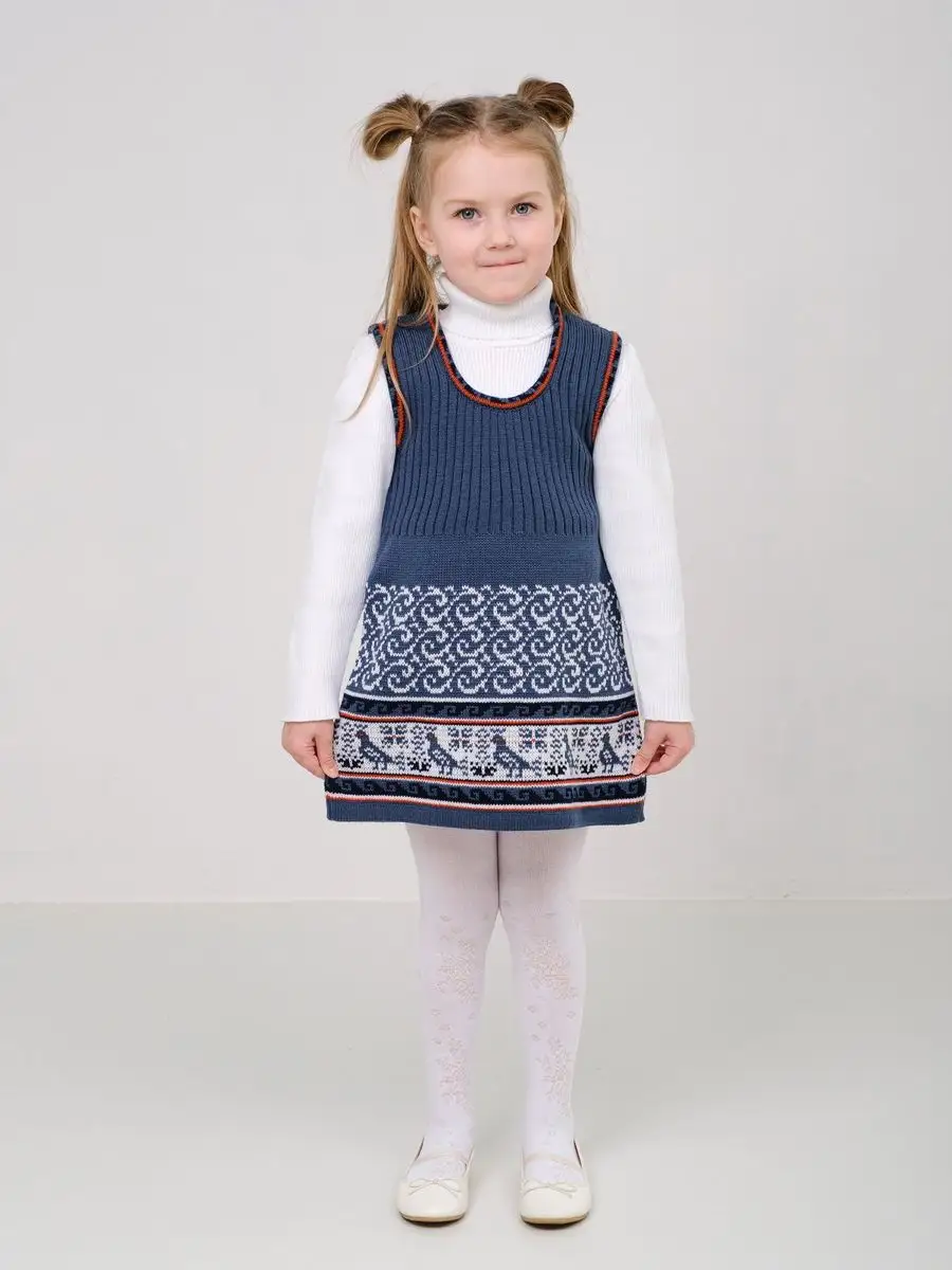 Сарафан для девочки вязаный с орнаментом. Сарафан платье выполнен из гипоаллергенной пряжи, поэтому юной моднице будет в нем комфортно, а благодаря полуприлегающему крою и вязке "резинкой" не стесняет движения. Сарафан для девочки в садик выполнен в технике жаккард, что делает модель нарядной и оригинальной. Сарафан подойдёт как для повседневной носки, так и на праздничный выход на утренник, день рождения, в цирк или в театр. При выборе размера советуем руководствоваться таблицей в карточке товара.