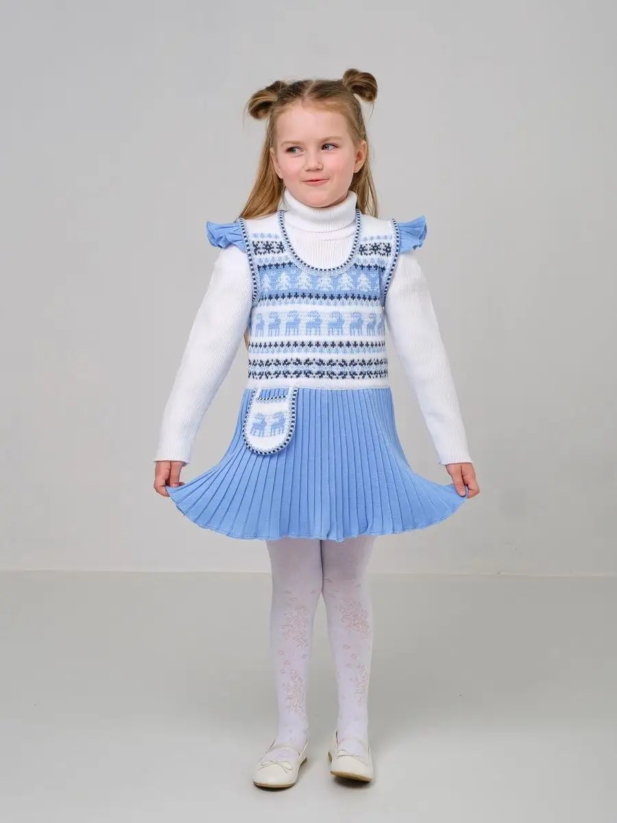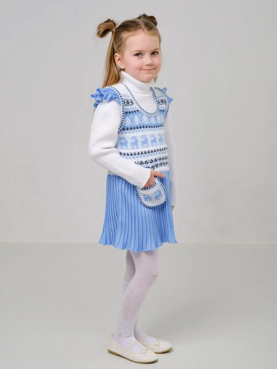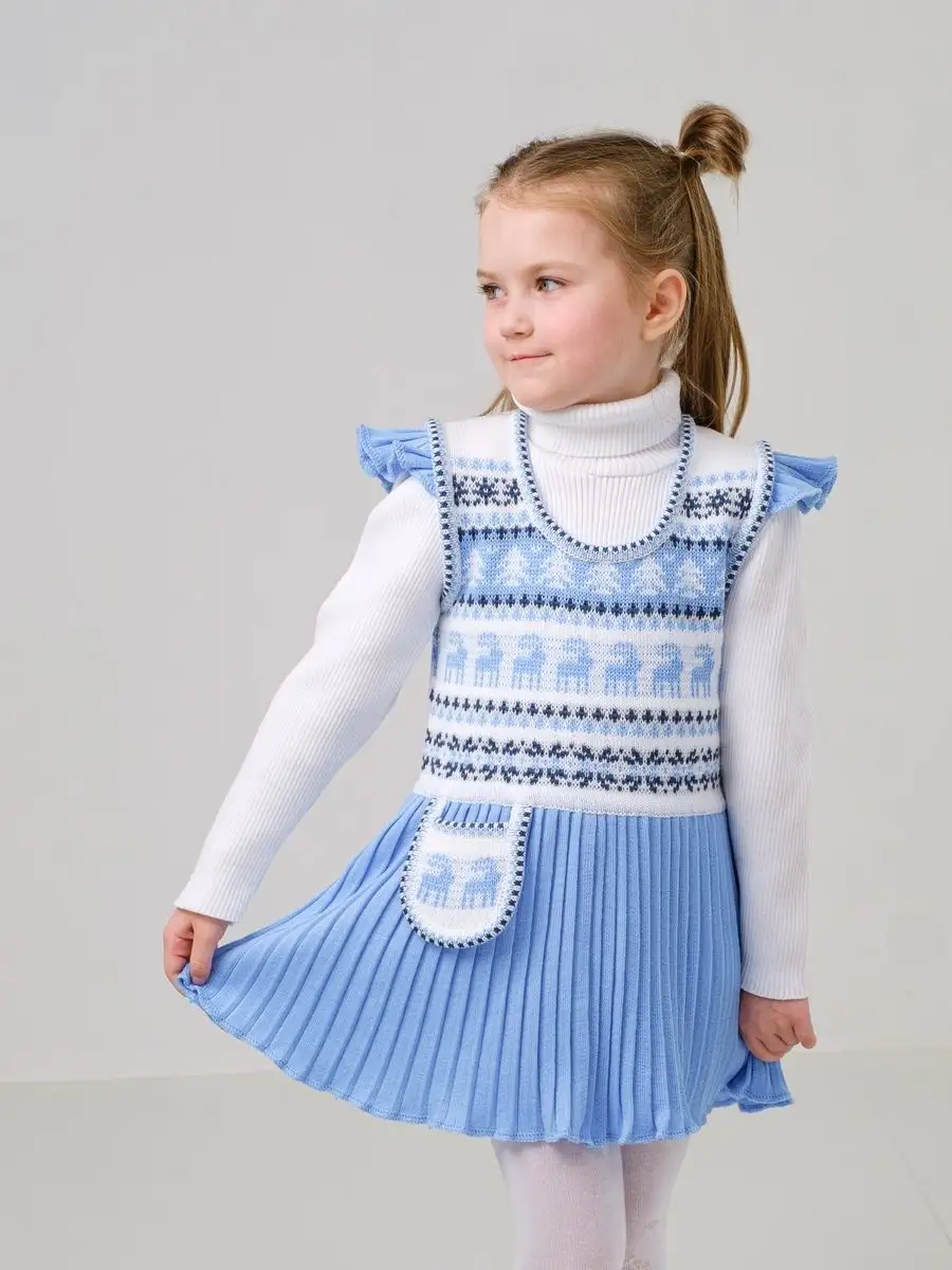 Нарядный сарафан для девочки с юбкой плиссе и кармашком-сумочкой. Особенностью модели является заниженная талия и крылышки на брителях, которые делают сарафан более интересным, а карман-сумочка придает функциональности. Платье вязаное имеет длину мини и может сочетаться как с леггинсами, так и с колготками. Сарафан для девочки украшен орнаментом в скандинавском стиле и цветной кеттлевкой на горловине и пройме. Сарафан подойдёт как для повседневной носки, так и на праздничный выход на утренник, день рождения, в цирк или в театр. Высокое качество, тщательность исполнения и ручная отделка являются неоспоримыми преимуществами. Платье сарафан для девочки выполнено из гипоаллергенной пряжи, поэтому юной моднице будет в нем комфортно, а благодаря свободному крою не стесняет движения. При выборе размера советуем руководствоваться таблицей в карточке товара.