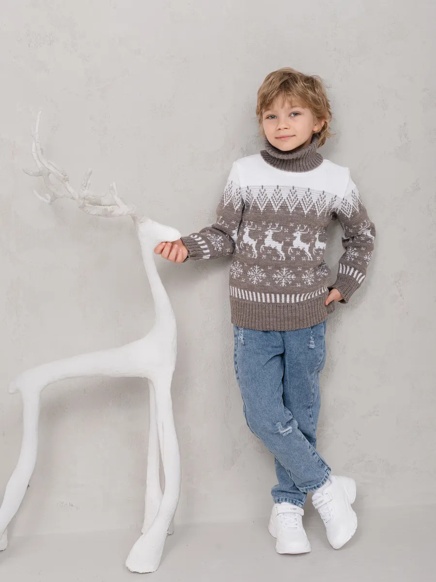 Классический вязаный свитер с оленями - необходимая вещь в гардеробе ребенка.Свитер детский подойдет как для мальчика, так и для девочки. Удобный высокий воротник хорошо защищает от холода. Свитер с горлом комфортная и теплая вещь для носки в холодную погоду, в новогодние дни, для праздничной фотосессии, для прогулки на лыжах и катания на коньках, а также станет прекрасной идеей для подарка.