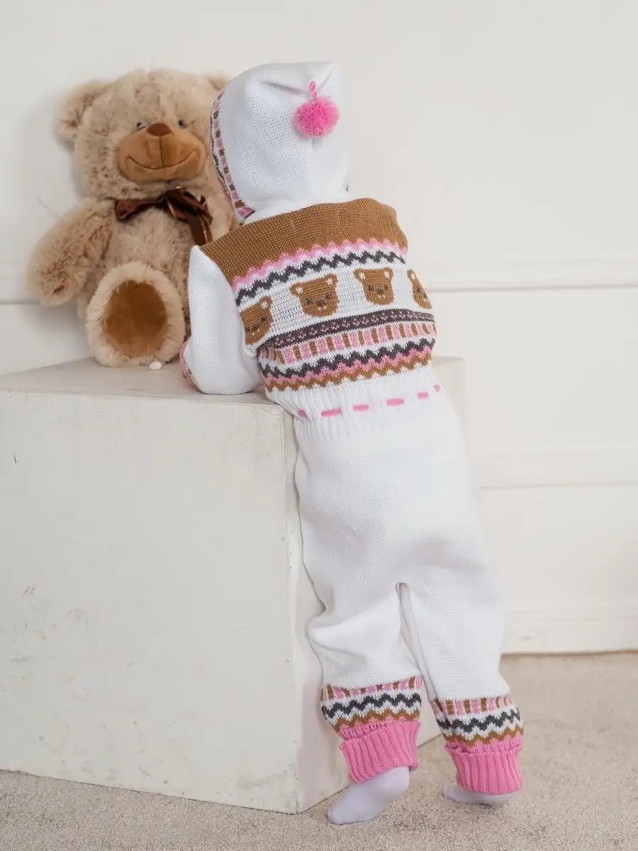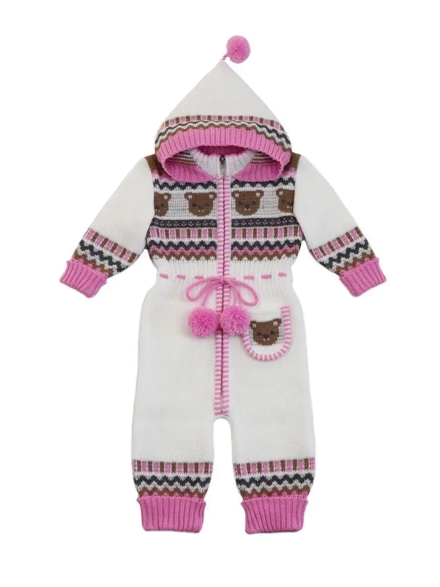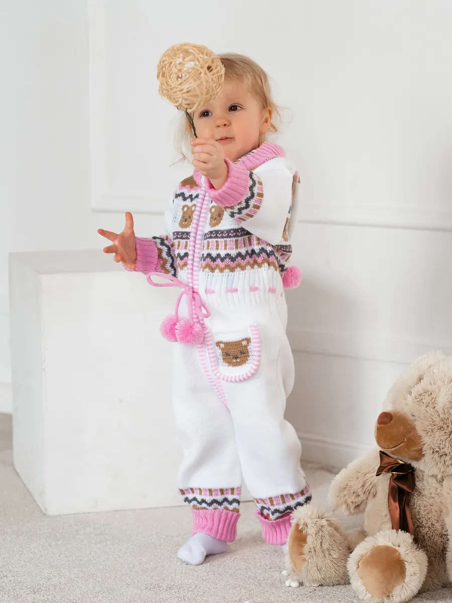 Милый комбинезон с мишками для малыша на молнии с помпончиком на макушке капюшона не оставит равнодушным никого! Модель комбинезона универсальная и подойдет как для девочки так и для мальчика. Комбинезон для новорожденного совмещает в себе практические и эстетические характеристики: накладной кармашек с мордочкой мишки, помпончики-завязочки, отгибающиеся манжеты на рукавах и штанишках, которые можно регулировать по мере роста малыша, удобный воротничок, место для подгузника.