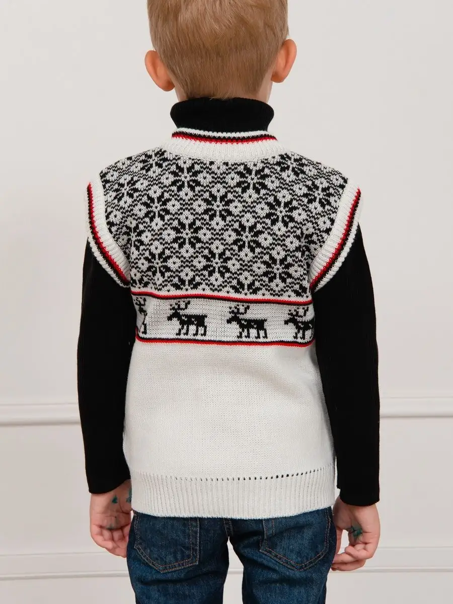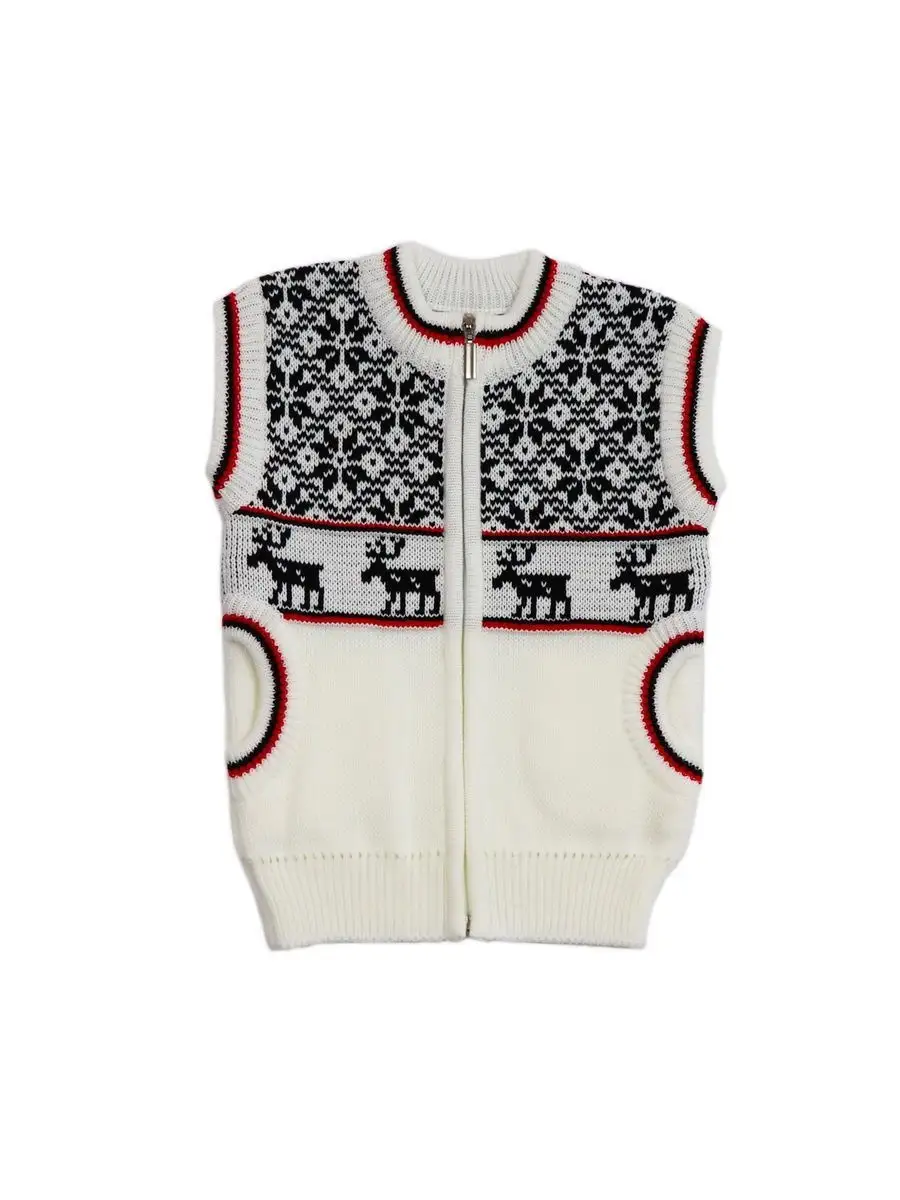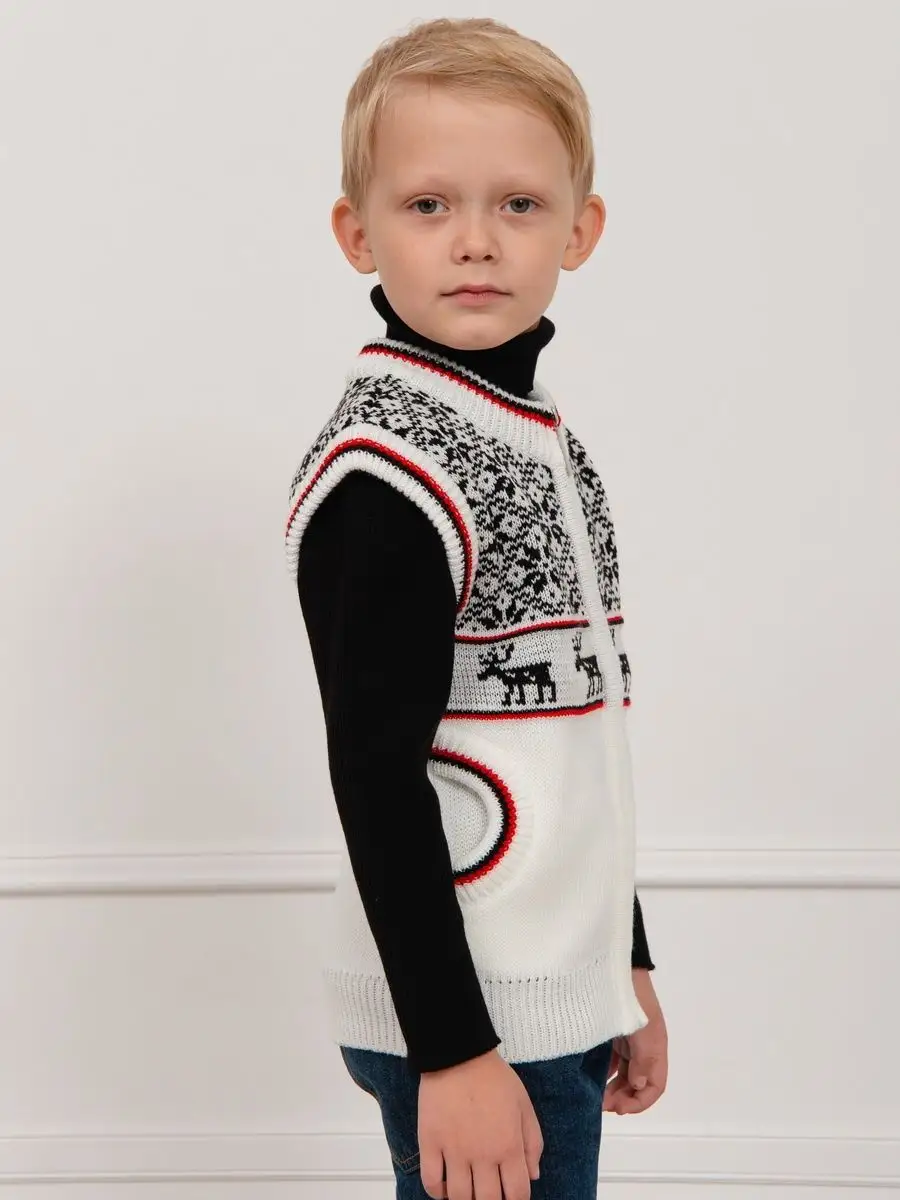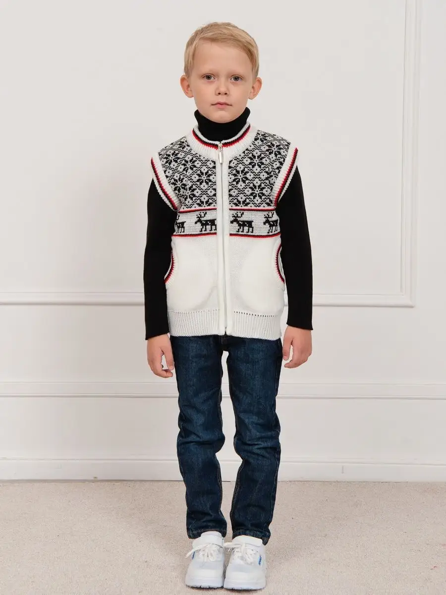Детская вязаная жилетка с орнаментом на молнии с боковыми карманами обязательно должна быть в повседневном гардеробе ребенка. Жилет выполнен в технике жаккард без протяжек нити на изнаночной стороне. Модель вязаной жилетки универсальная и подойдет как для девочки, так и для мальчика. Свободный крой жилетки обеспечивает идеальную посадку и эффектно дополнит многослойный образ с водолазкой, рубашкой или блузкой в сочетании с брюками, джинсами или юбкой. Вязаный жилет подойдет для повседневной носки в школу и детский сад, для дома и для прогулок в любое время года. Высокое качество, тщательность исполнения и ручная отделка являются неоспоримыми преимуществами. При выборе размера советуем руководствоваться таблицей в карточке товара.